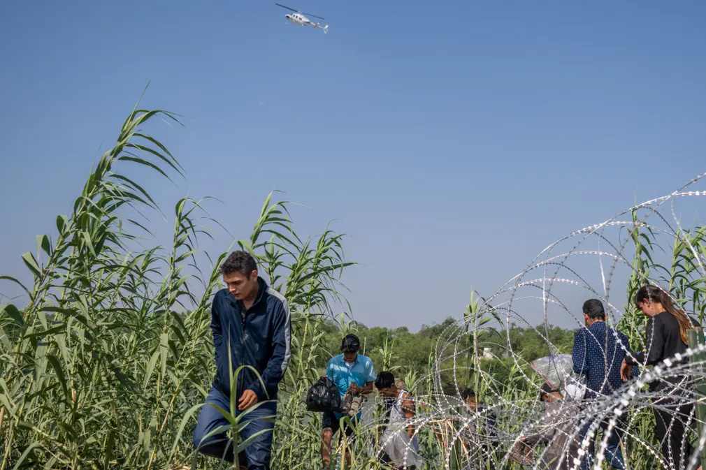 مهاجران El Salvador پس از عبور از آمريکا در Eagle Pass از سيم هاي خاردار در کنارRio Grande عبور مي کنند. يک قاضي هفته گذشته به منظور مسدود کردن طرح دولت بايدن براي از برداشتن محدوديت هاي دوران همه گير حکم داد که اين محدوديت ها براي افرادي که به دنبال پناهندگي در مرز جنوبي هستند بايد ادامه يابد.