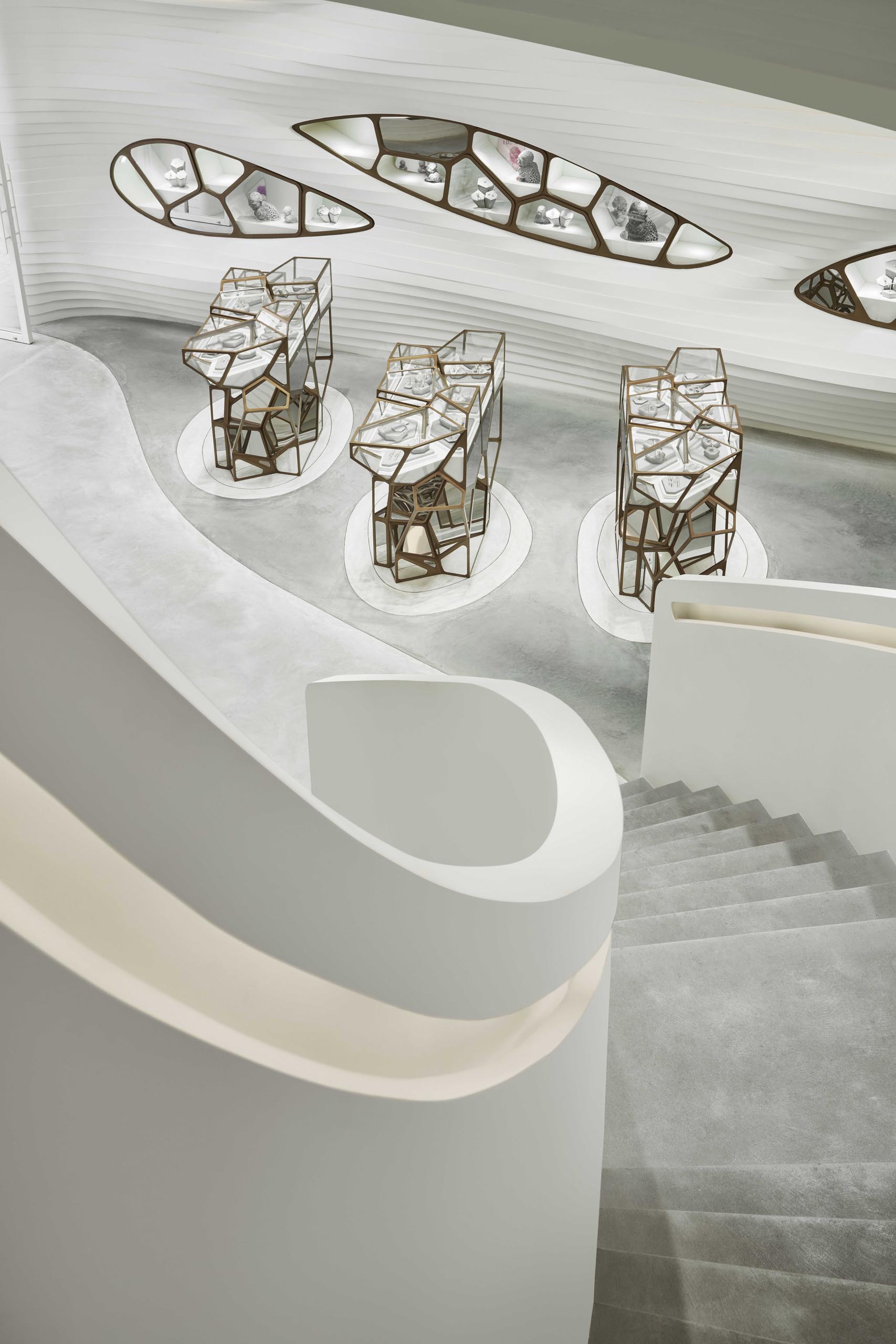 پله هاي هموار شما را به سفري بين طبقات مي برد و مناظري جديدي از فضاي داخلي غار مانند و مجسمه ها ارائه مي دهد. نورپردازي در سرتاسر فضا تقريباً فوق العاده است، به طوري که نورپردازي پنهان در سقف، نرده پله و زير پله ها، درخششي ملايم به فضا مي بخشد و طراحي را برجسته مي کند.