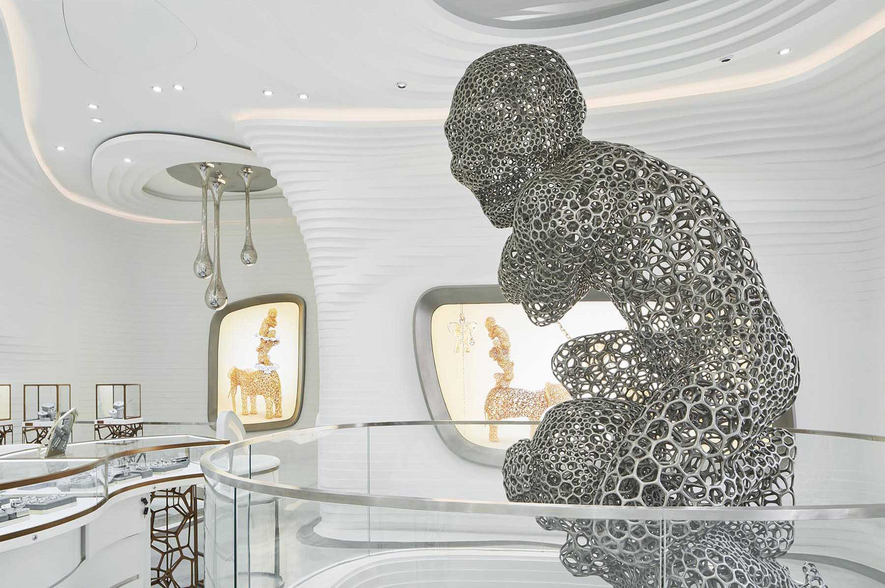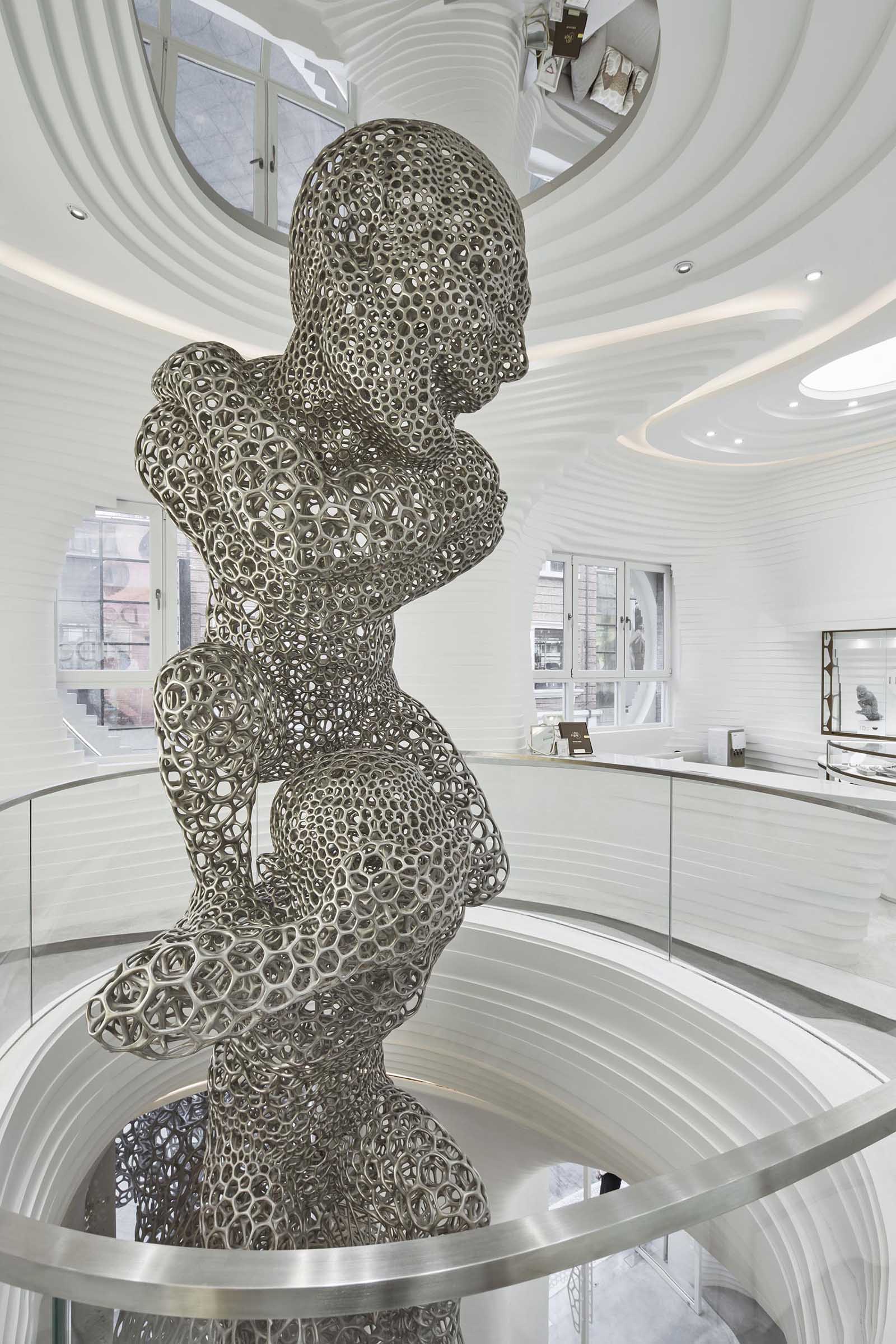 طبقه دوم خانه داراي نماهاي بيشتري است، با اين حال، اين مجسمه بزرگ است که به مرکز توجه فضا تبديل مي شود. اين هنرمند از چاپ سه بعدي مومي در مقياس بزرگ و ريختهگري استفاده کرد که يک شبکه پراکنده و در عين حال با ساختار ايجاد ميکند که همزمان از زيستشناسي سلولي و ساختارهاي اتمي الهام گرفته شده است.