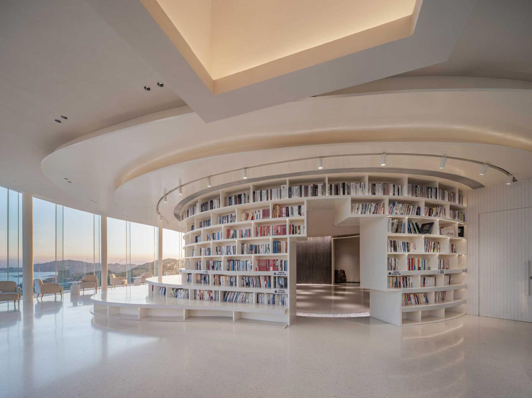 به محض ورود، مهمانان با يک قفسه کتاب که دور ديوار بيروني يک اتاق تاريک پيچيده شده و منحني هاي ساختمان را دنبال مي کند، وارد فضاي مطالعه مي شوند.