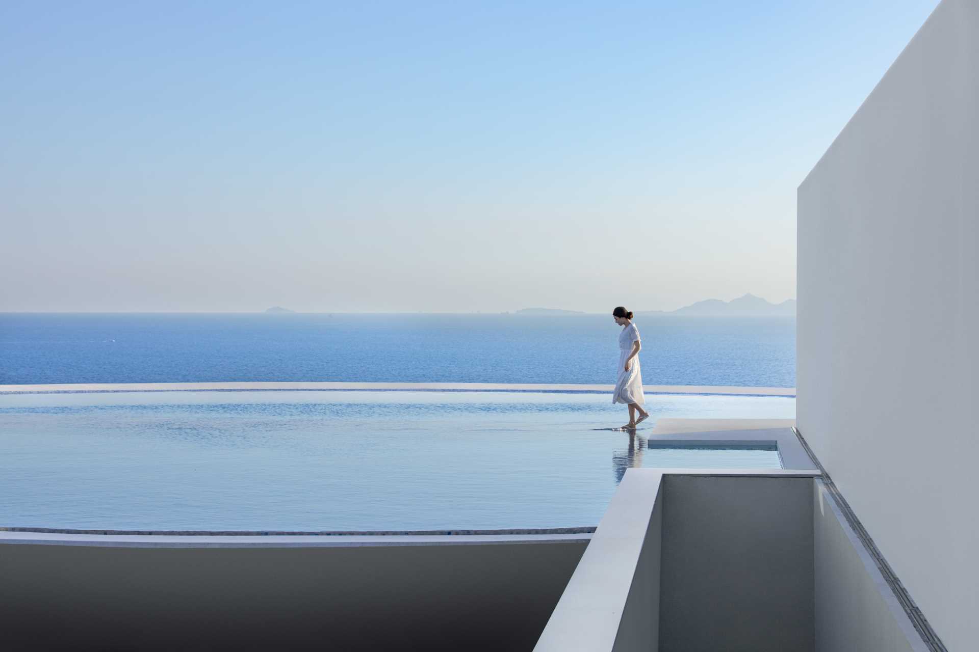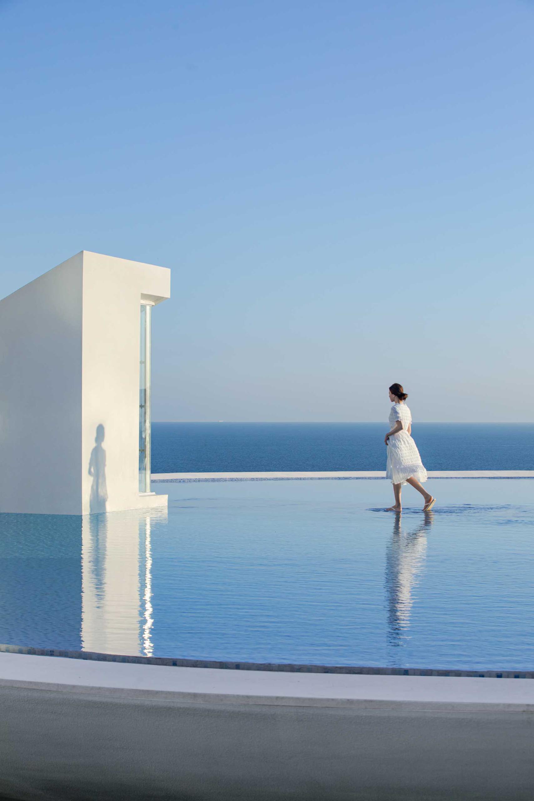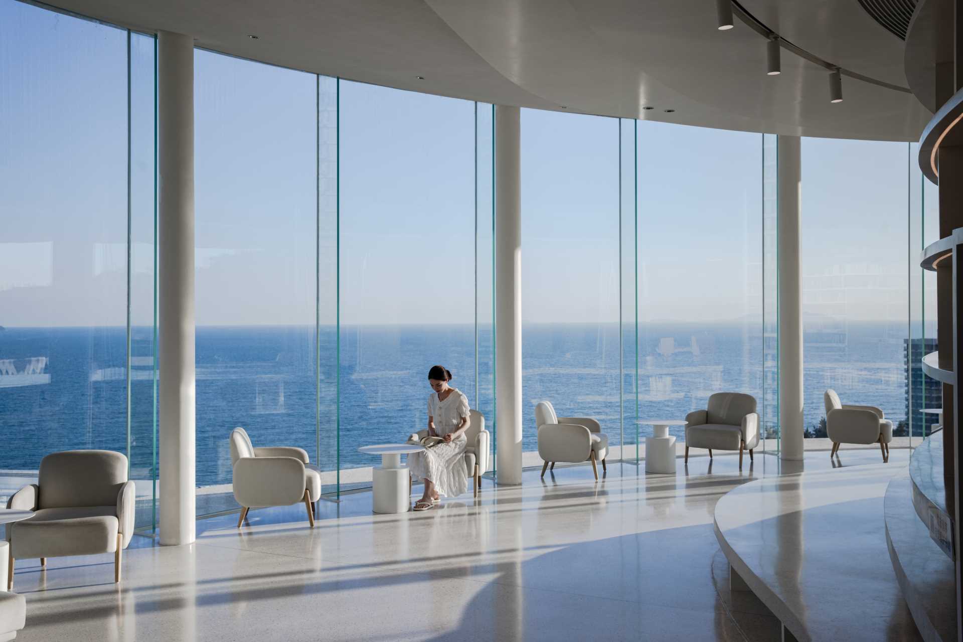 پنجره هاي کف تا سقف منحني ساختمان را دنبال مي کنند و منظره بي وقفه آب را ارائه مي دهند.
