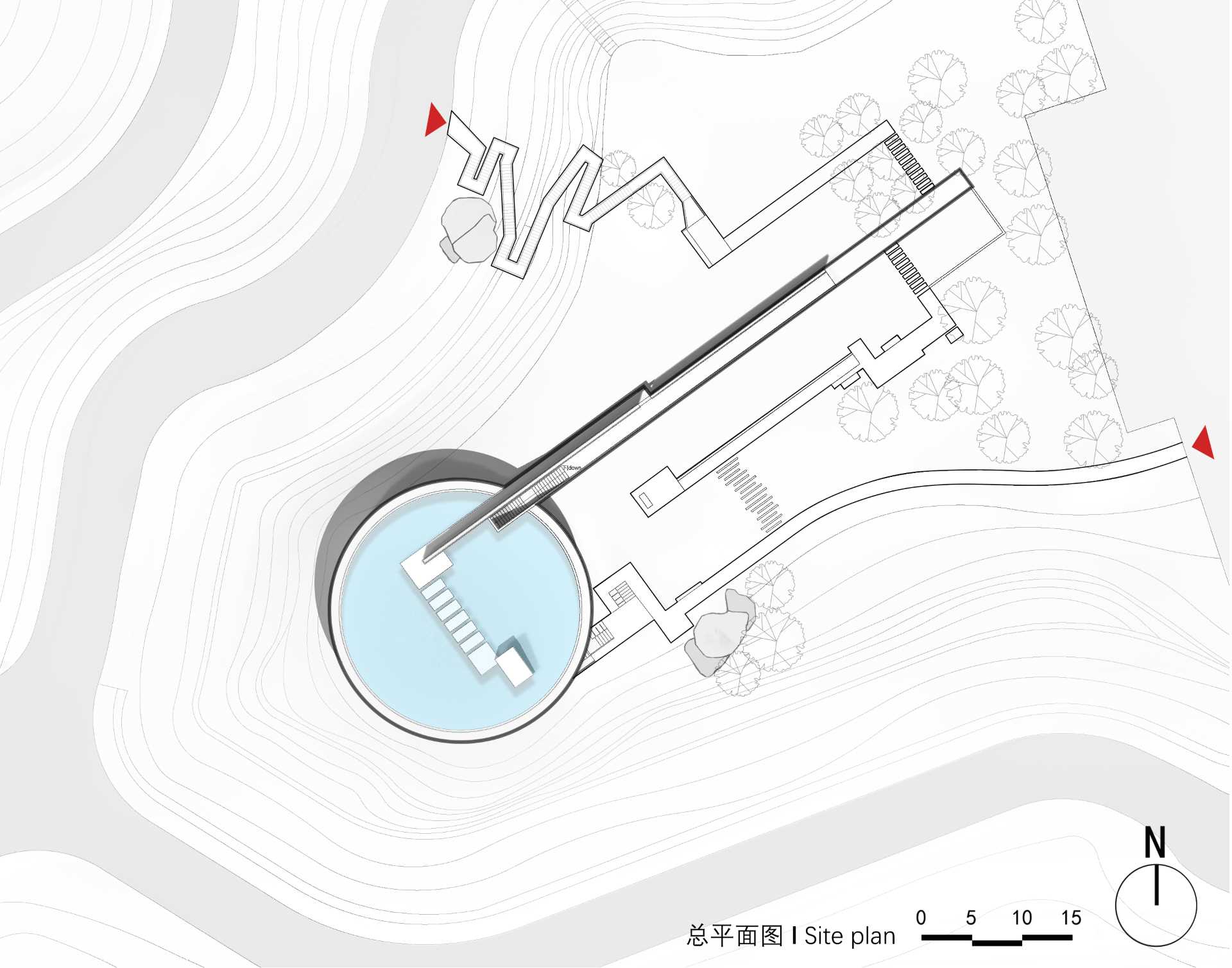 از طريق پله هايي که با سطح آب همخواني دارند مي توان به سکويي در وسط استخر رسيد.