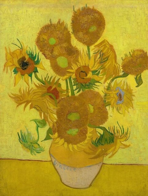 او چندين نسخه از آفتابگردان خلق کرد که مشهورترين آنها آفتابگردانهاي داخل گلدان محسوب ميشوند. حيرتانگيز است که ون گوگ توانست با سه طيف مختلف رنگ زرد و مقداري سبز چنين نقاشيهاي زيبايي خلق کند.