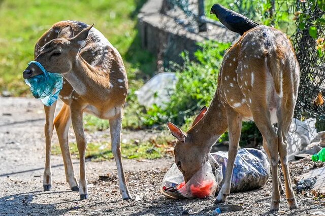 آهوهاي وحشي در ميان کيسه‌هاي زباله در منطقه Trincomalee سريلانکا/