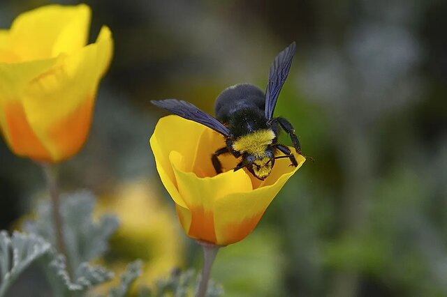 يک زنبور کاليفرنيايي به دنبال شهد در خشخاش در اقيانوس آرام، گرو، ايالات متحده است/ عکس: Rory Merry/Zuma Press Wire/Rex/Shutterstock