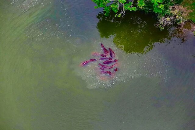 اسب‌هاي آبي در رودخانه‌اي نزديک دورادال، در منطقه آنتيوکيا کلمبيا. اين کشور اخيراً اعلام کرده است که براي انتقال ۷۰ اسب آبي به حفاظت‌گاه‌هاي حيوانات در کشورهاي ديگر، ۳.۵ ميليون دلار (۳ ميليون پوند) بودجه لازم است.