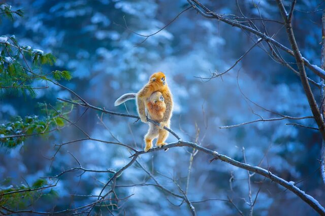 ميمون‌هاي پوزه طلايي در حال انقراض در حفاظت‌گاه طبيعي فوپينگ، چين. عکاس، کيانگ ژانگ، مي‌گويد: سردترين روز ژانويه بود که يک خانواده ميمون طلايي را پيدا کرديم. اين ميمون همراه با بچه‌اش راه مي‌رود و از روي درخت مي‌پرد. نيازي به نگراني بابت زمين خوردن نوزاد هم نيست؛ چراکه دست‌ها و پاهاي او مادرش را محکم در آغوش مي‌گيرند. من اين صحنه را ديدم و به سرعت اين لحظه شگفت‌انگيز را ثبت کردم.»