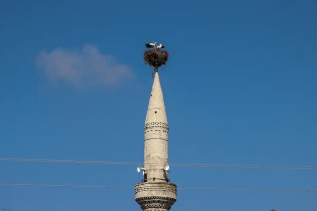 لک‌لک‌هاي سفيد بر بالاي مناره‌اي که در اثر زلزله‌هاي ويرانگر ترکيه در ماه فوريه آسيب ديده است، لانه مي‌کنند. پس از آن اين لانه به طور امن به گنبد مسجد در عثمانيه منتقل شده است.