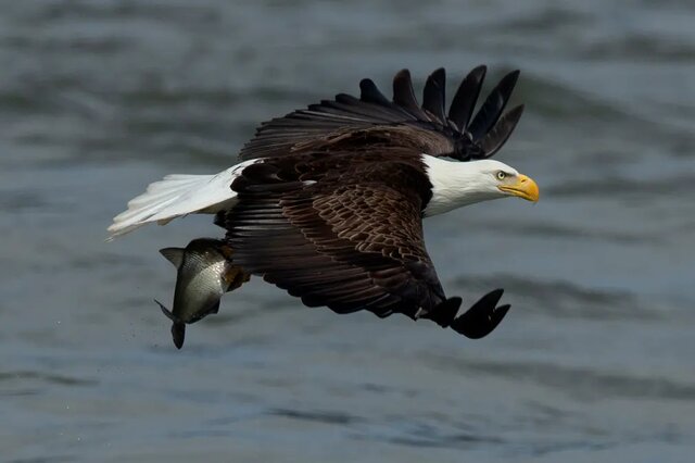 يک عقاب سرسفيد، ماهي را از رودخانه ساسکوهنا در مريلند ايالات متحده شکار کرده و در هوا حمل مي‌کند. افزايش تعداد اين نژاد از عقاب‌ها، نشان دهنده‌ يک عملکرد موفقيت‌آميز براي حافظان محيط زيست بوده است. عکس: مايکل رينولدز/ EPA