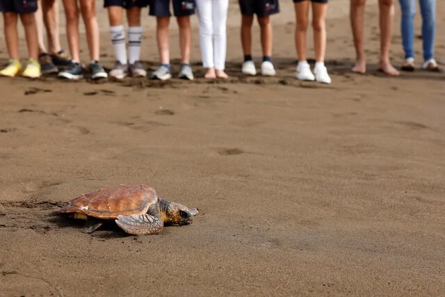 دانش‌آموزان مدرسه‌ يک لاک‌پشت دريايي را مشاهده مي‌کنند که پس از بهبودي از جراحات در ساحل ملنارا در جزيره گران کاناريا، اسپانيا رها شد.
