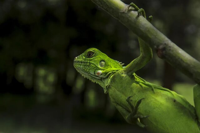 يک ايگواناي سبز به شاخه‌اي در بخش غربي جنگل‌هاي باراني آمازون، نزديک لتيسيا، کلمبيا چسبيده است.