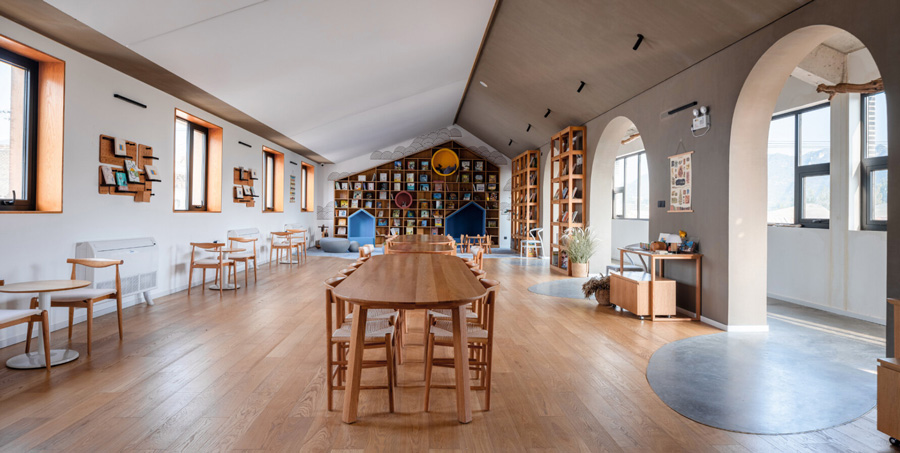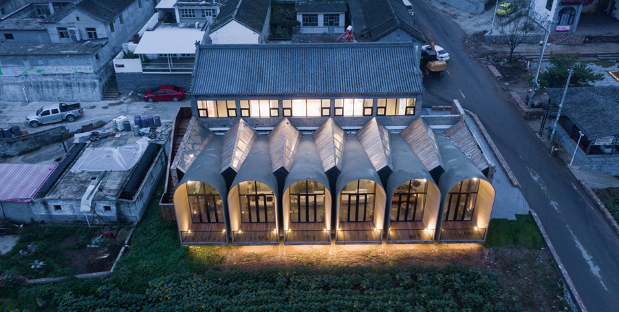 به گزارش گالري آنلاين، در ميان ساختمان هاي مختلفي که SYN Architects در دهکده Tiangang Zhixing چين طراحي کرده است، مجموعه بازسازي شده سازه هايي که به عنوان "اتاق نشيمن" دهکده ناميده مي شود به وضوح اين ايده را نشان مي دهد. بازسازي «اتاق نشيمن» در مجموع ساختار اصلي ساختمان کميته روستا را حفظ ميکند و يک کافه و منطقه اي براي فعاليت کودکان را در طبقات بالا و پايين معرفي ميکند.