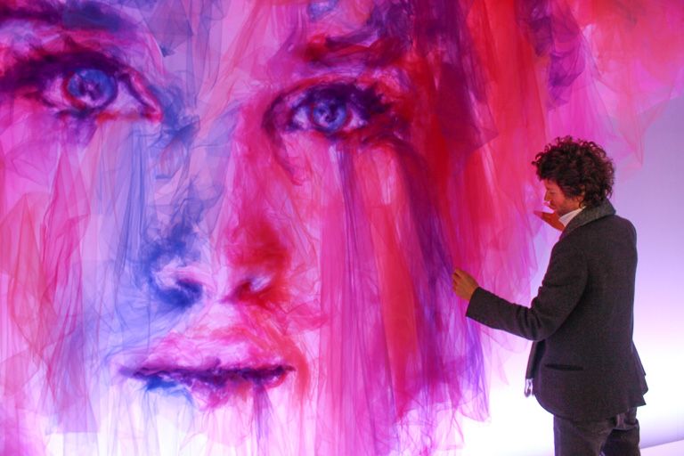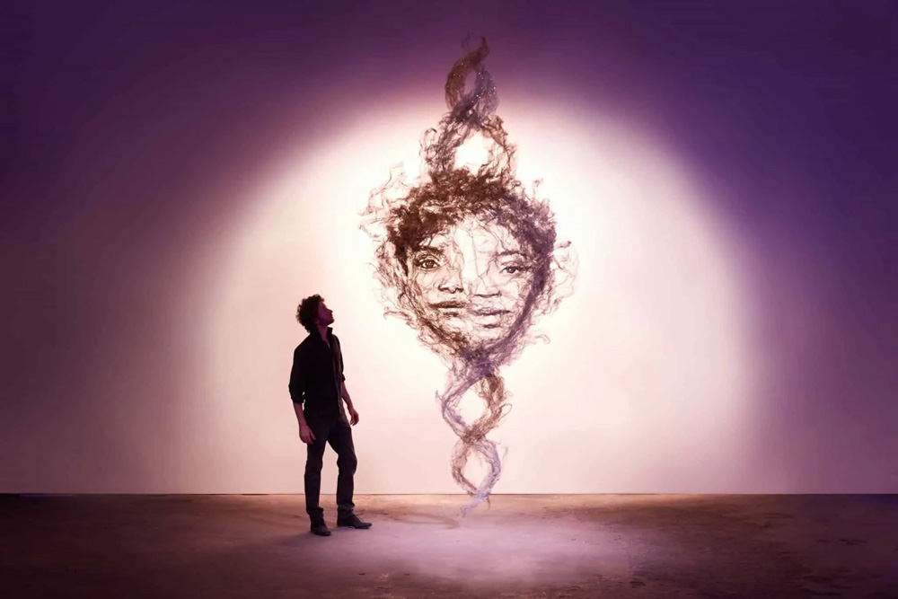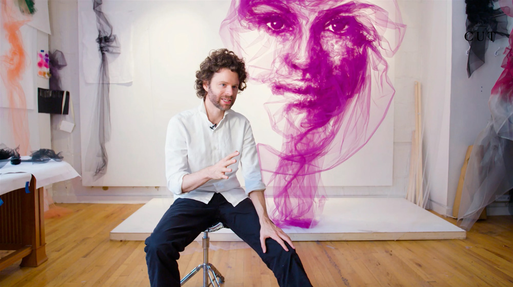 از دور به نظر ميرسد که اين پرترههاي پيچ در پيچ با ضربههاي ماهرانه قلممو نقاشي شدهاند، اما يک قدم نزديکتر شويد و واقعيت شگفتانگيز آشکار ميشود: اين پرترهها با دقت از پارچه تاشده ساخته شدهاند.