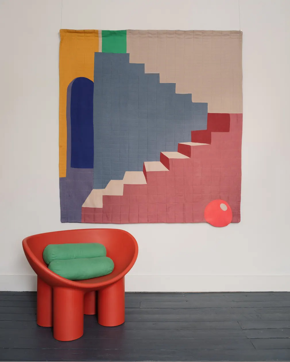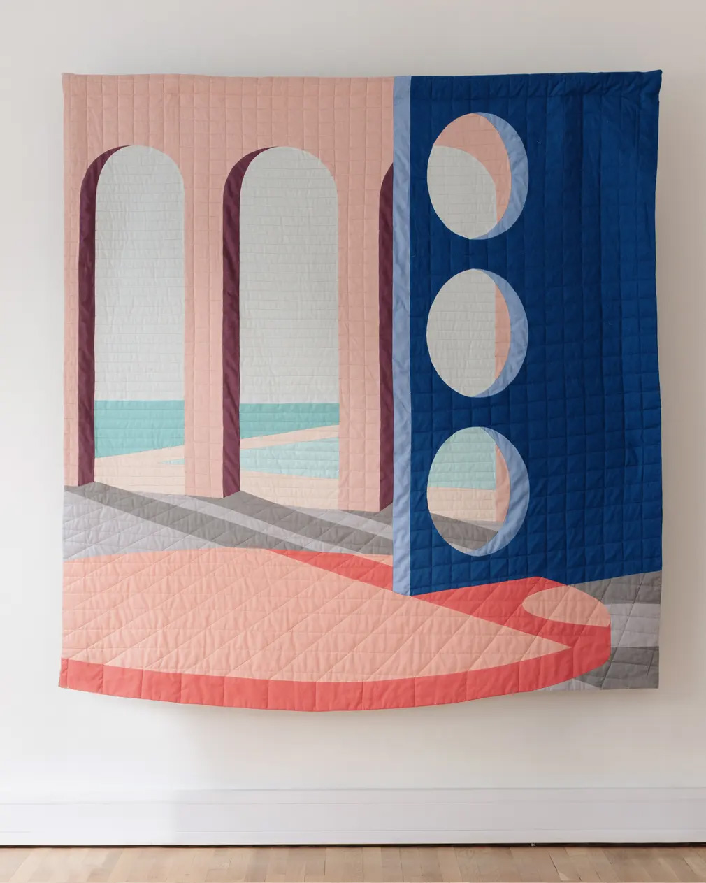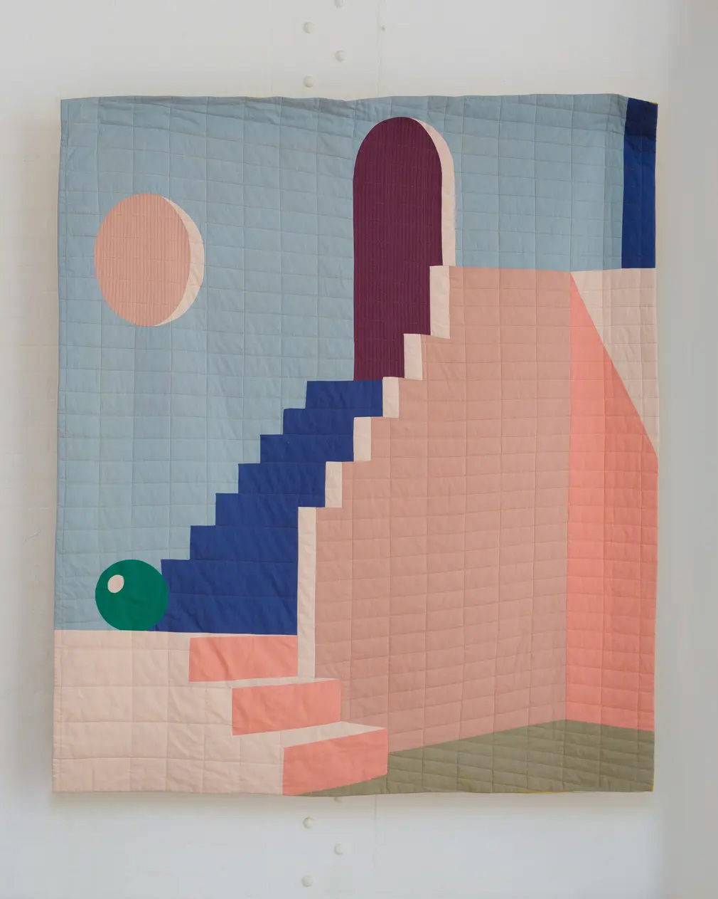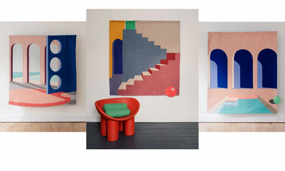 کيت ويليامز، هنرمند بريتانيايي، لحافهاي ديواري در مقياس بزرگ ميسازد که ساختمانهاي پست مدرن خيالي را به تصوير ميکشد.