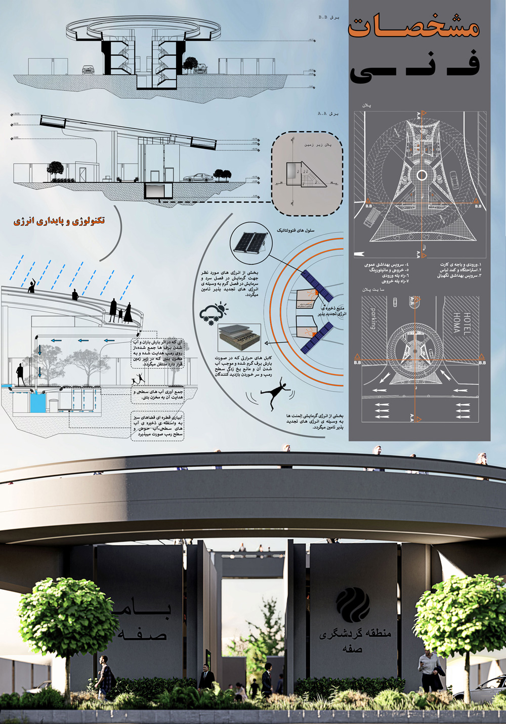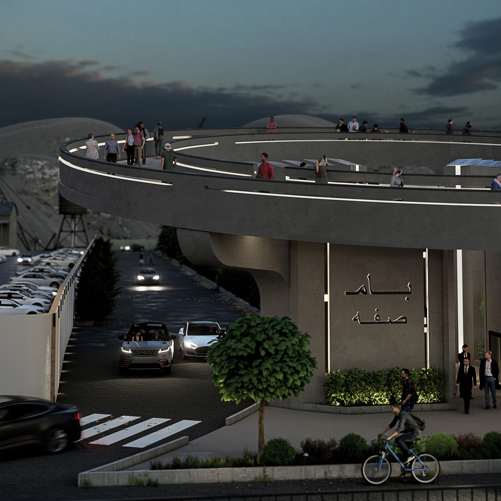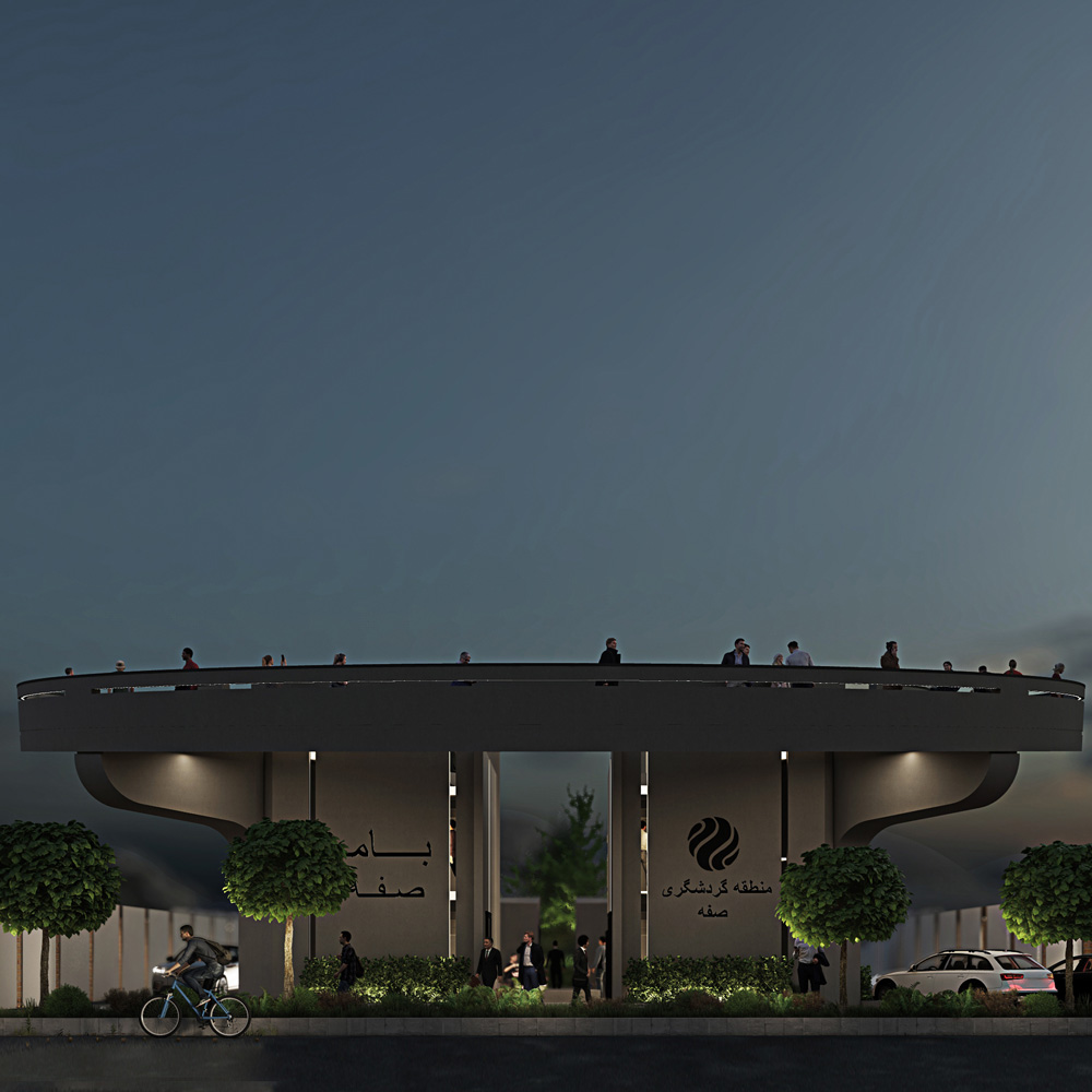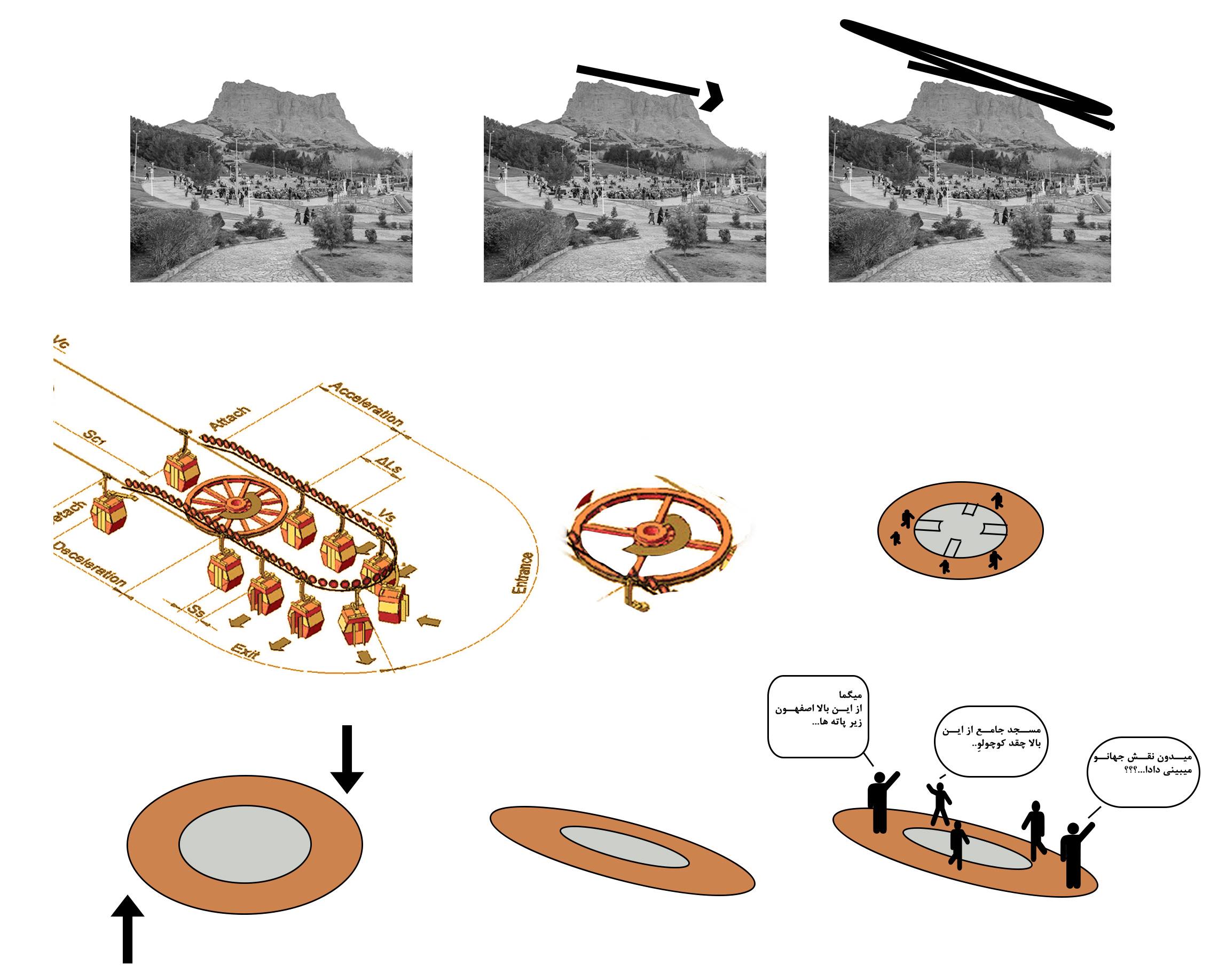يکي از موارد حائز اهميت در طراحي، کاربري مجموعه بود. يکي از مهم ترين تفريح ها براي جذب گردشگر به اين مجموعه تله کابين و يکي از مهم ترين اجزا تله کابين چرخ دنده هاي کاهش سرعت (deceleration) است که رمپ دوار ما از بالا به آن شبيه ميباشد گويي ماشين ها را به داخل مجموعه هدايت ميکند. همچنين باتوجه به اينکه کوه صفه به صورت کج ميباشد و ورودي به مجموعه نيز با شيب ملايمي به سمت داخل ميرسد، ما صفحه رمپ را نيز به همين شکل با شيب ملايمي کج درنظر گرفتيم تا ديد و منظر مناسبي نسبت به شهر براي بازديد کنندگان فراهم آورد.