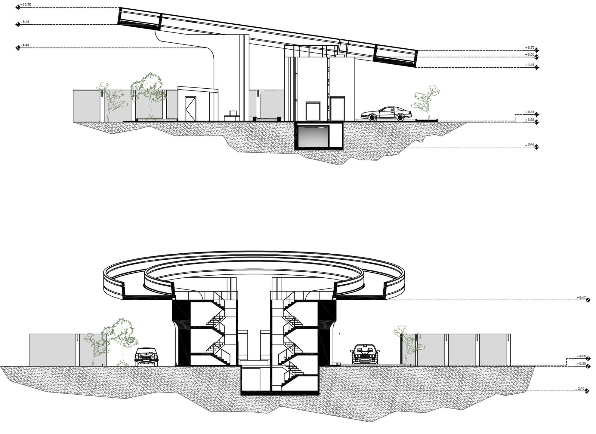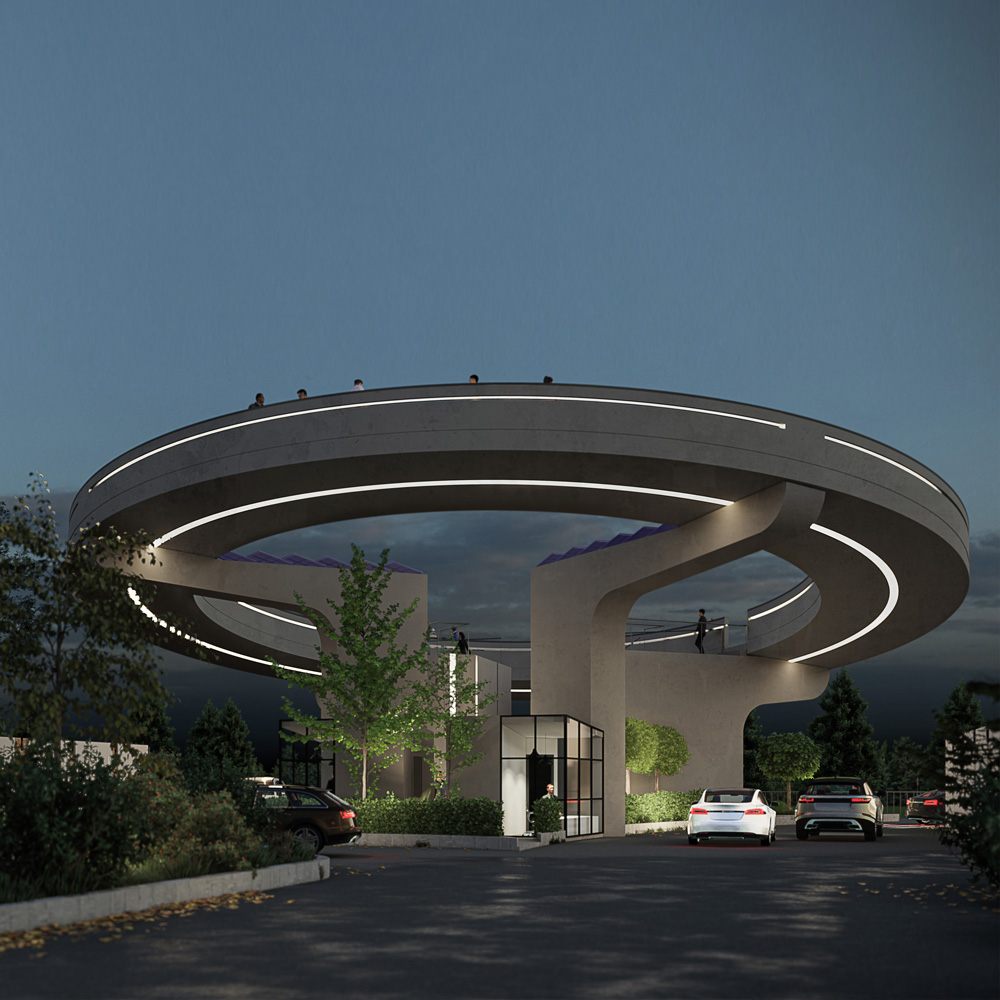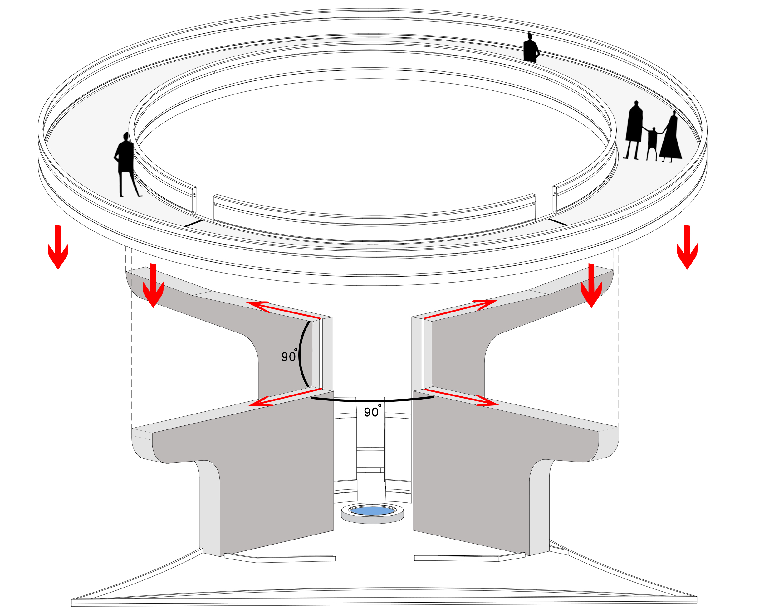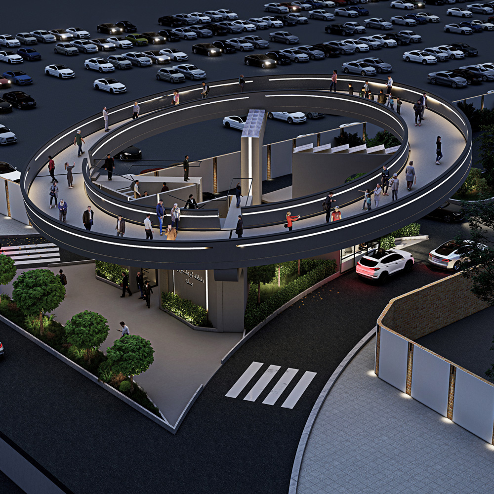 يکي از موارد حائز اهميت در طراحي، کاربري مجموعه بود. يکي از مهم ترين تفريح ها براي جذب گردشگر به اين مجموعه تله کابين و يکي از مهم ترين اجزا تله کابين چرخ دنده هاي کاهش سرعت (deceleration) است که رمپ دوار ما از بالا به آن شبيه ميباشد گويي ماشين ها را به داخل مجموعه هدايت ميکند. همچنين باتوجه به اينکه کوه صفه به صورت کج ميباشد و ورودي به مجموعه نيز با شيب ملايمي به سمت داخل ميرسد، ما صفحه رمپ را نيز به همين شکل با شيب ملايمي کج درنظر گرفتيم تا ديد و منظر مناسبي نسبت به شهر براي بازديد کنندگان فراهم آورد.