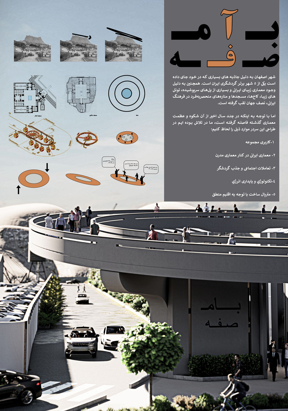 در طراحي اين سردر هدف تنها کاربري سردر نبود بلکه ما به فکر جذب افراد عادي و گردشگران نيز بوده ايم. به اين شکل که افرادي که در حال گذر هستند مشتاق و کنجکاو به بازديد از سطح شهر توسط رمپ شوند. فضاي موجود در مرکز رمپ يک پلازا و فضاي اجتماعي کوچک را به وجود آورده و اين باعث بالا رفتن تعاملات اجتماعي و احساس سرزندگي ميشود. اين مجموعه ميتواند نقطه اي براي جذب گردشگر و بازديد کننده براي مجموعه گردشگري صفه و همچنين شهر اصفهان باشد.