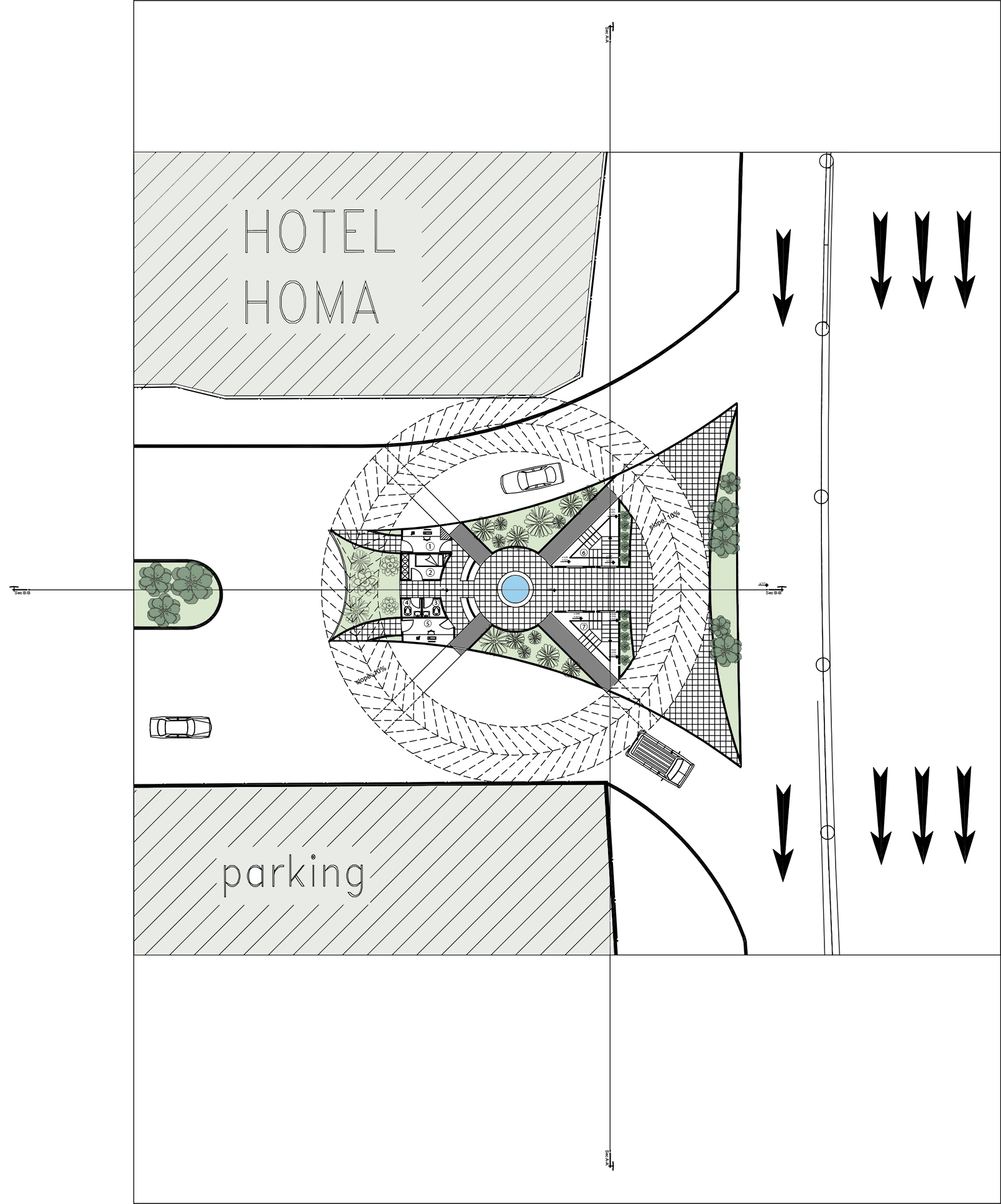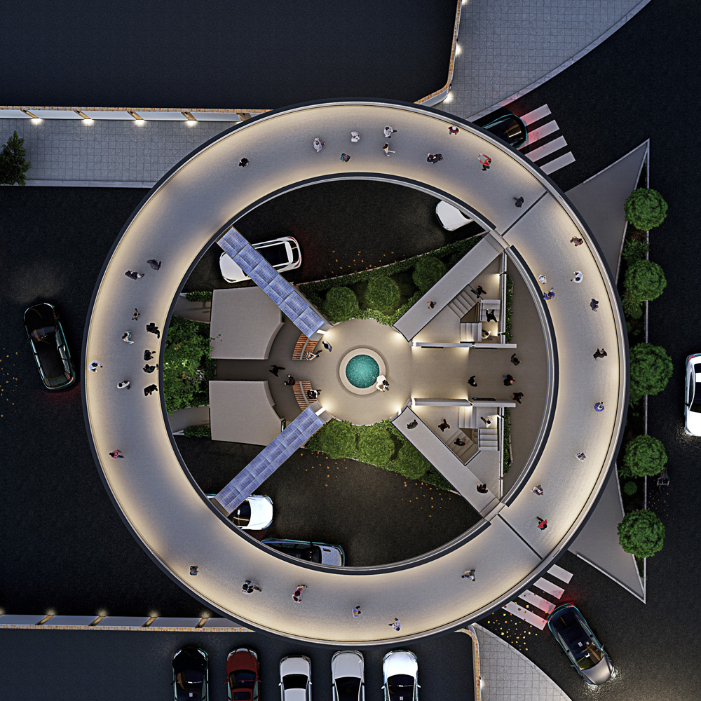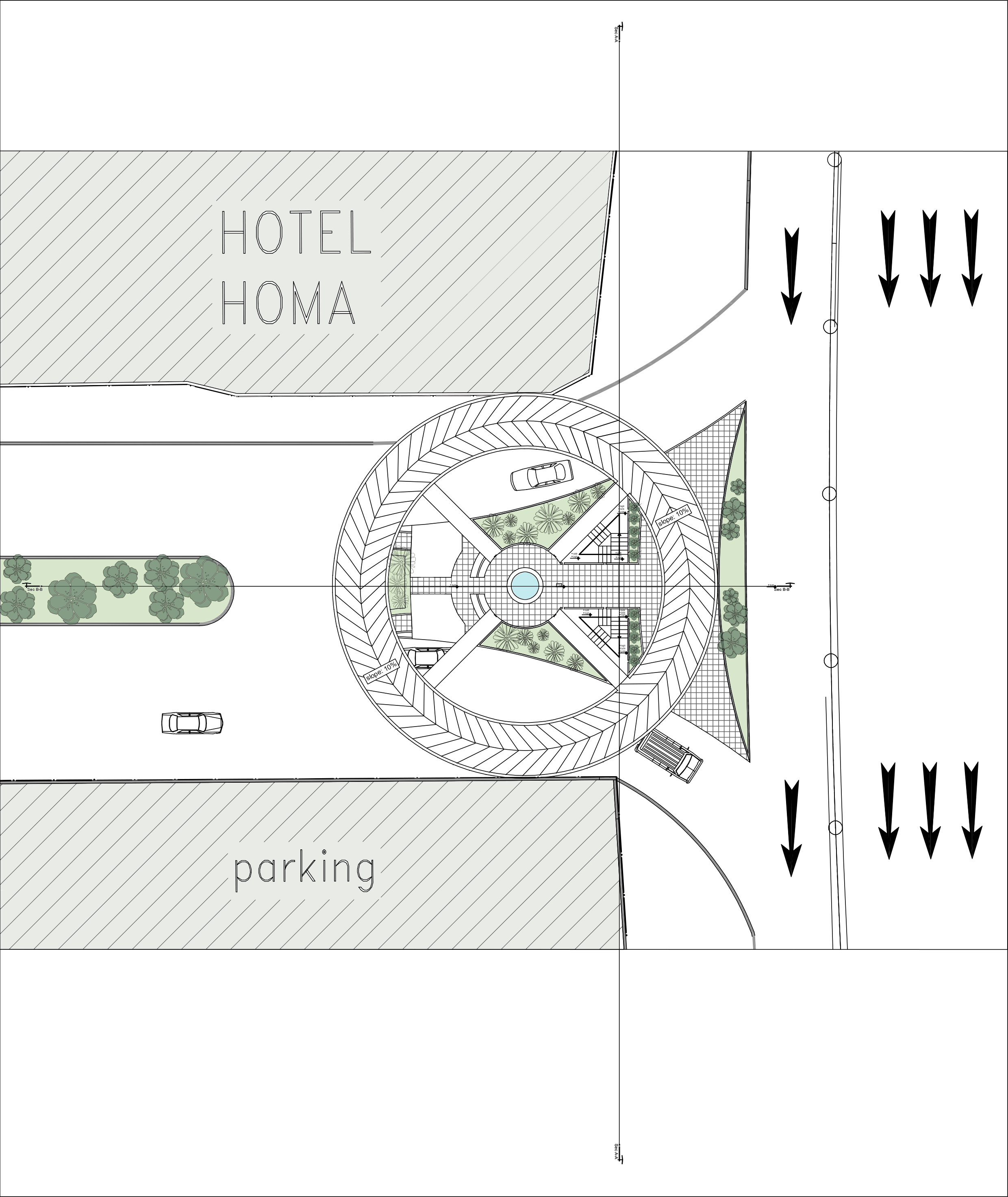 همچنين با توجه به وجود حياط مرکزي در برخي بناهاي اصلي و معروف اصفهان مانند ميدان نقش جهان و ميدان امام با ايجاد مرکزيت در کليت سردر و رمپ، قرار دادن حوض در وسط و فضاي سبز در اطراف آن سعي بر نمايان کردن اين تلفيق داشتيم.