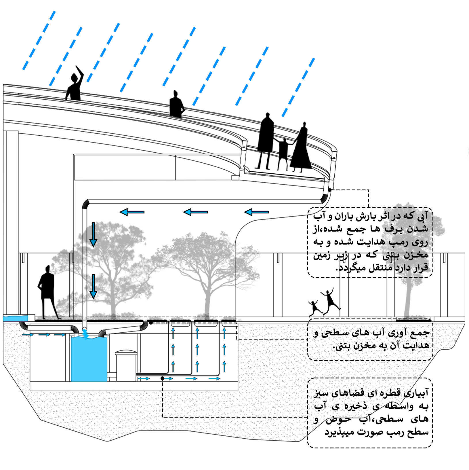 همچنين درصورت بارش برف و باران آب اضافي جمع شده در سطح رمپ و همچنين آب هاي سطحي روي زمين توسط آبراه هايي که در کناره هاي مسير آن ايجاد شده به سمت پايين حرکت کرده و توسط لوله هايي که در بدنه پايه هاي رمپ تعبيه شده به سمت زيرزمين و مخزن آب هدايت ميشود.