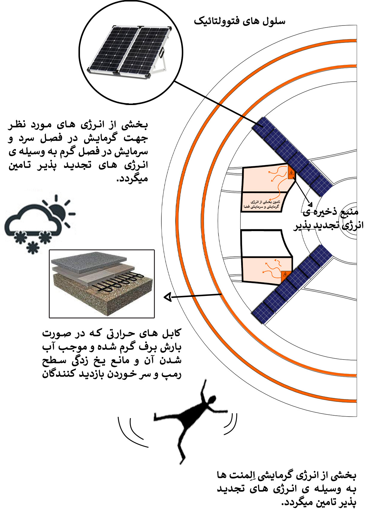 به دليل قرارگيري اصفهان در اقليم خشک و نيمه خشک و وجود نور خورشيد به مقدار قابل ملاحظه روي دو پايه پشتي سردر که در ارتفاع بالاتر قرار گرفته اند صفحات فتوولتاييک را درنظر گرفته ايم که بخشي از برق مجموعه ( سيستم گرمايشي و سرمايشي و المنت هاي رمپ) را تامين ميکند.