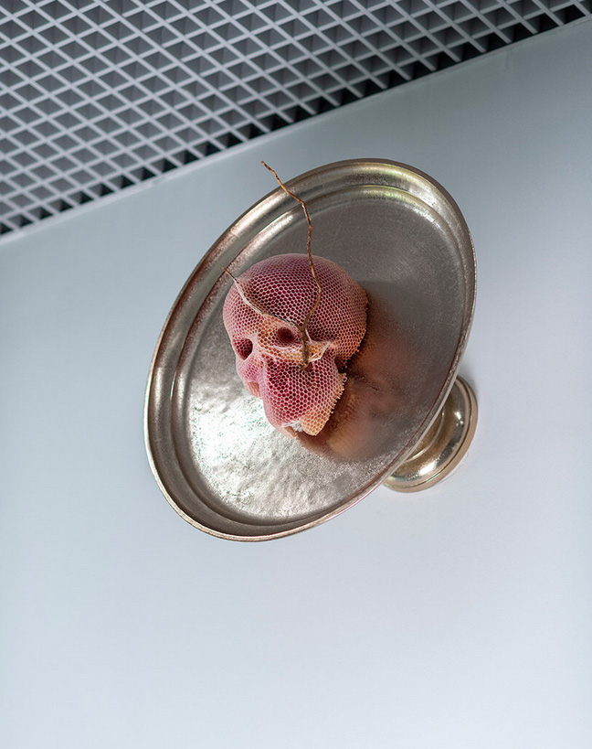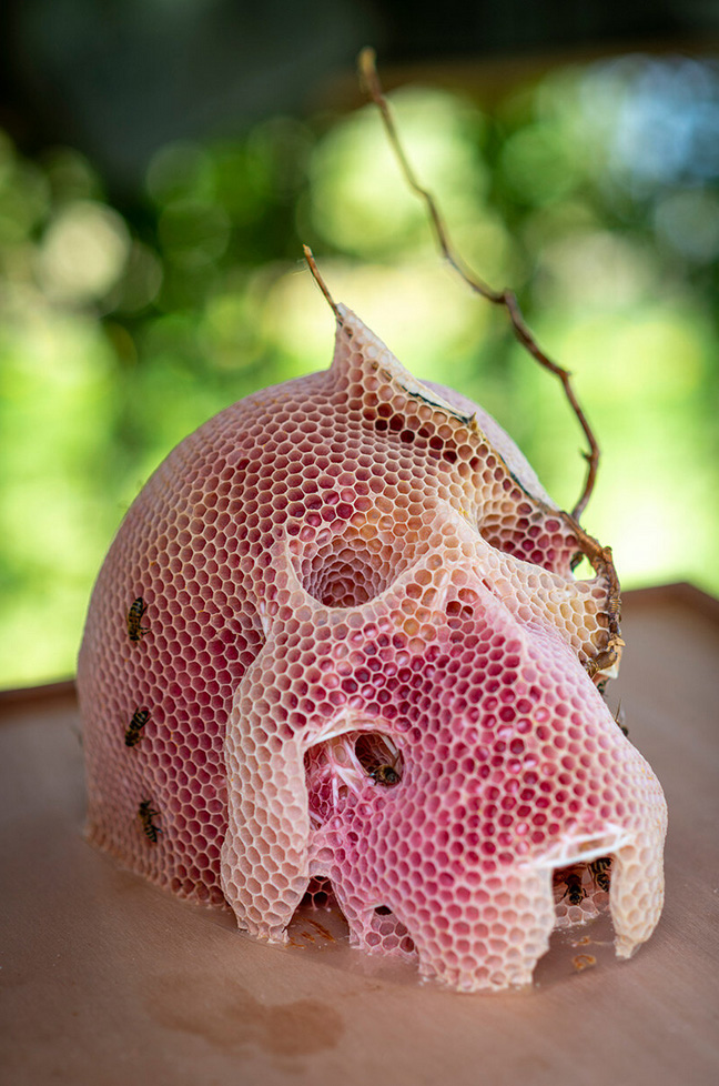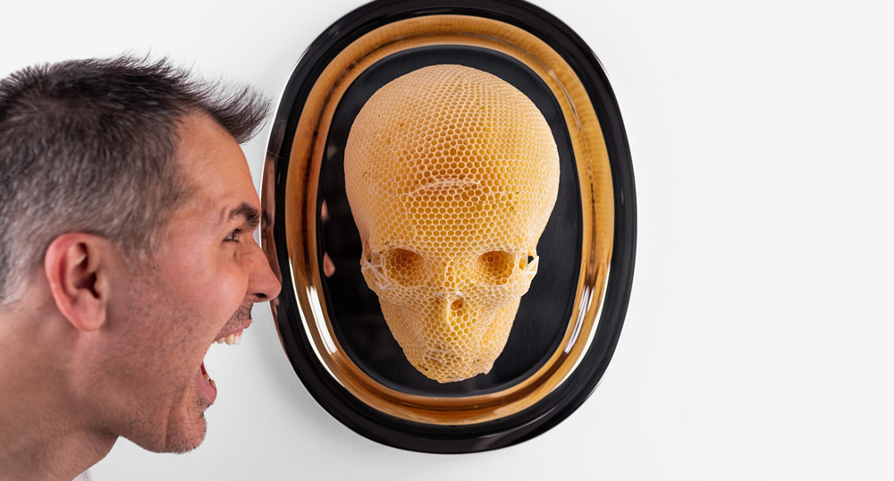 اين هنرمند براي تقويت بعد معنوي داستان، زماني که زنبورها مشغول ساختن سر بودند، رنگدانه قرمزي به کندو اضافه کرد. اگرچه زنبورها در واقع کور رنگ هستند و نمي توانند قرمز را ببينند، اين رنگدانه در سراسر ساختار موم زنبور عسل گنجانده شده است و به عرفاني بودن اثر اضافه مي کند. نتيجه يک نمايش بصري خيره کننده از وارونگي طبيعت است، زيرا جمجمه از يک جسم بي جان به نمادي از زندگي جديد تبديل مي شود.