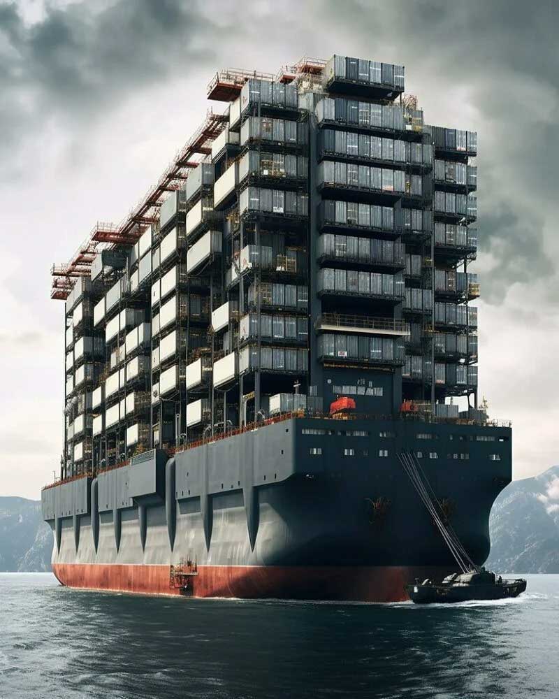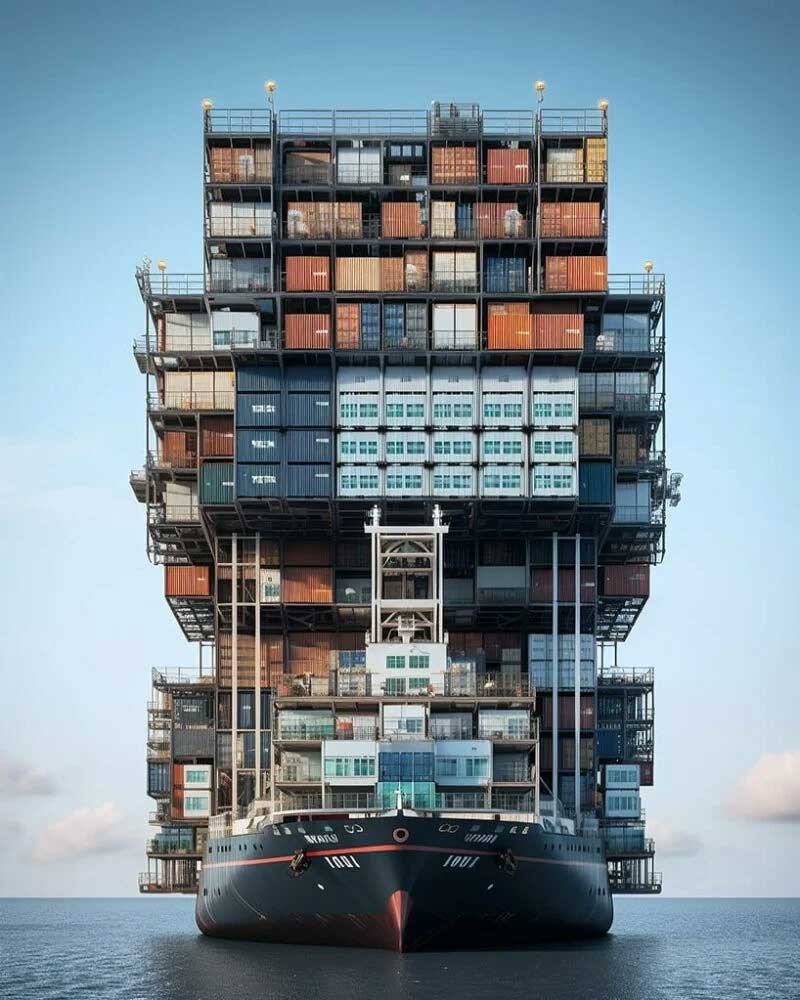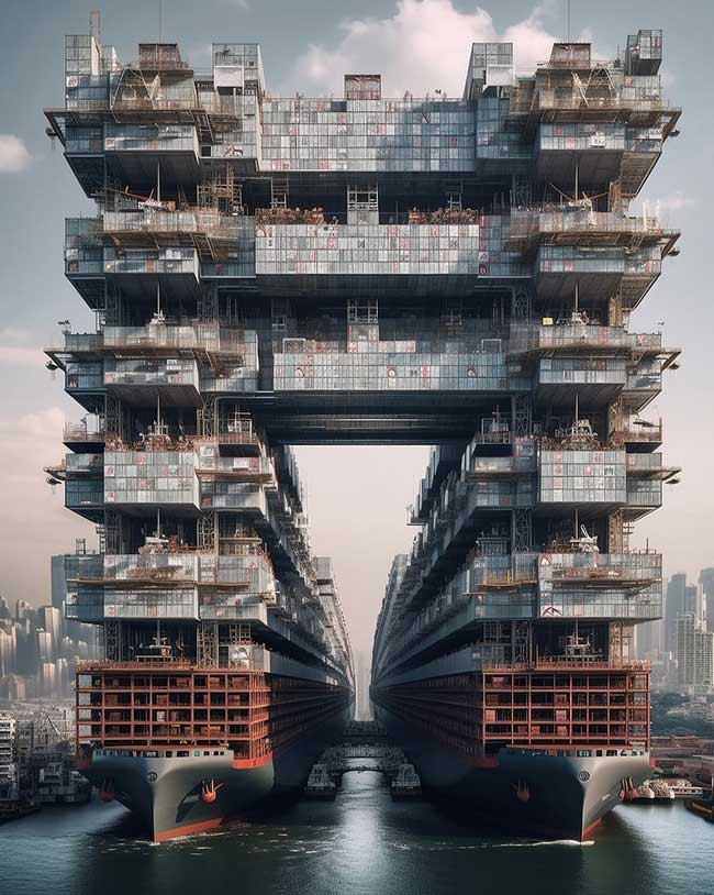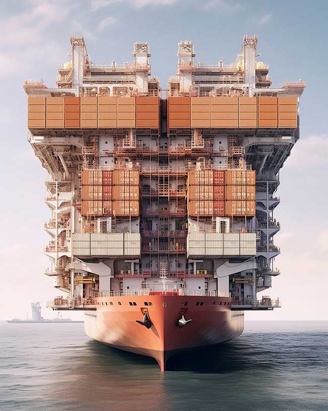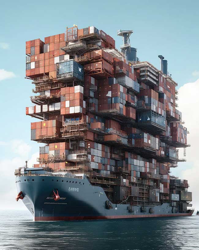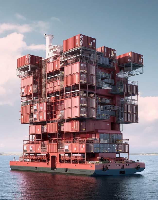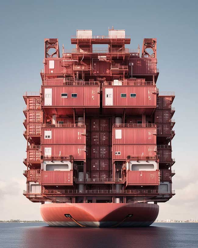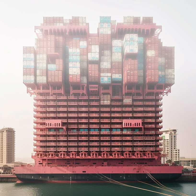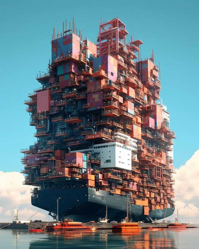 کاوه نجفيان اکوسيستمي از کشتي‌هاي بزرگ توليد شده توسط هوش مصنوعي را به تصوير مي‌کشد که در دريا رها شده‌اند.