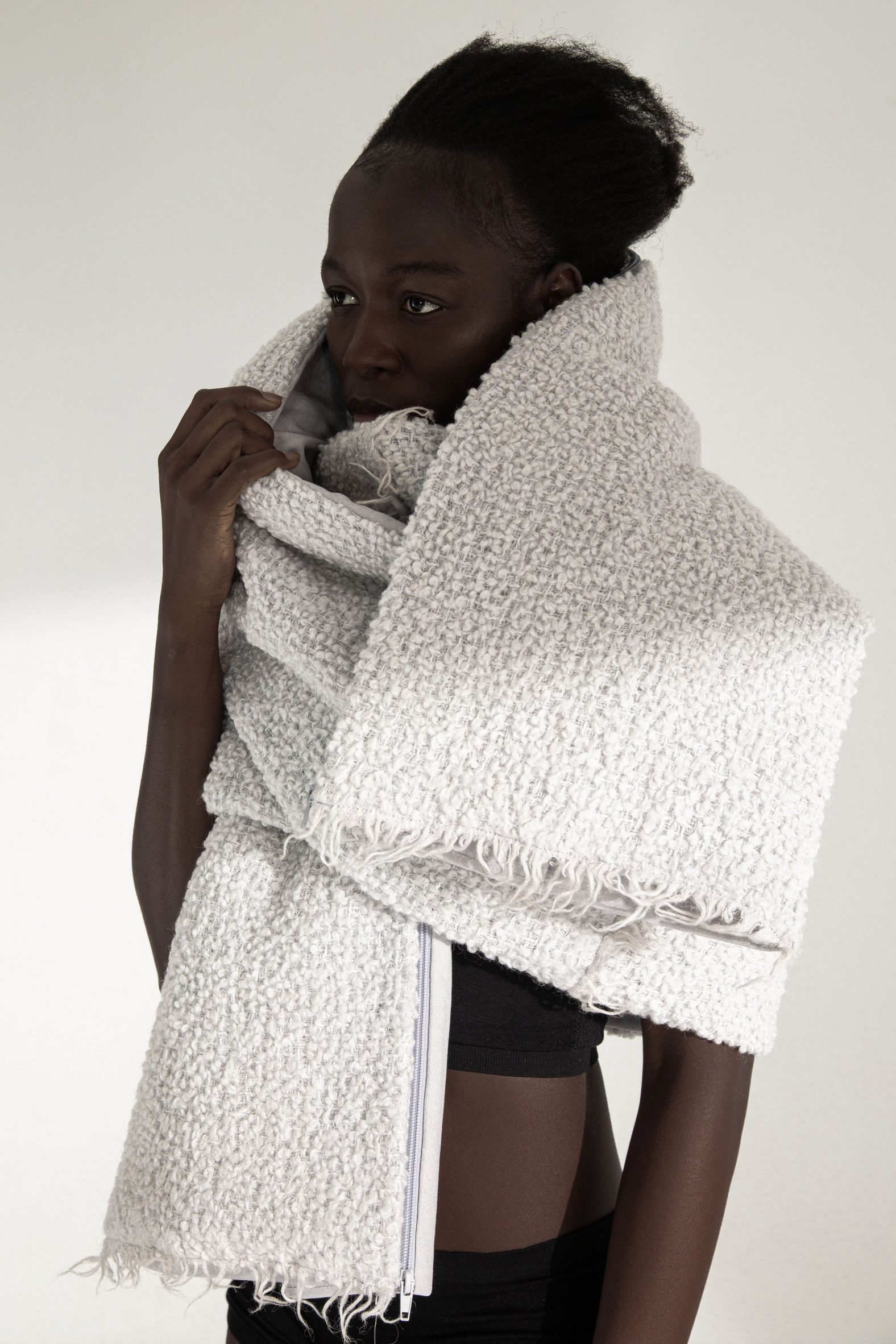 يکي ديگر از لباسها از کالکشن signature look، يک ژاکت سفيد جعبه مانند با يک کلاه اختياري است که برعکس، به تصوير فرشتگان نگهبان و جليقههاي ضد گلوله اشاره دارد.