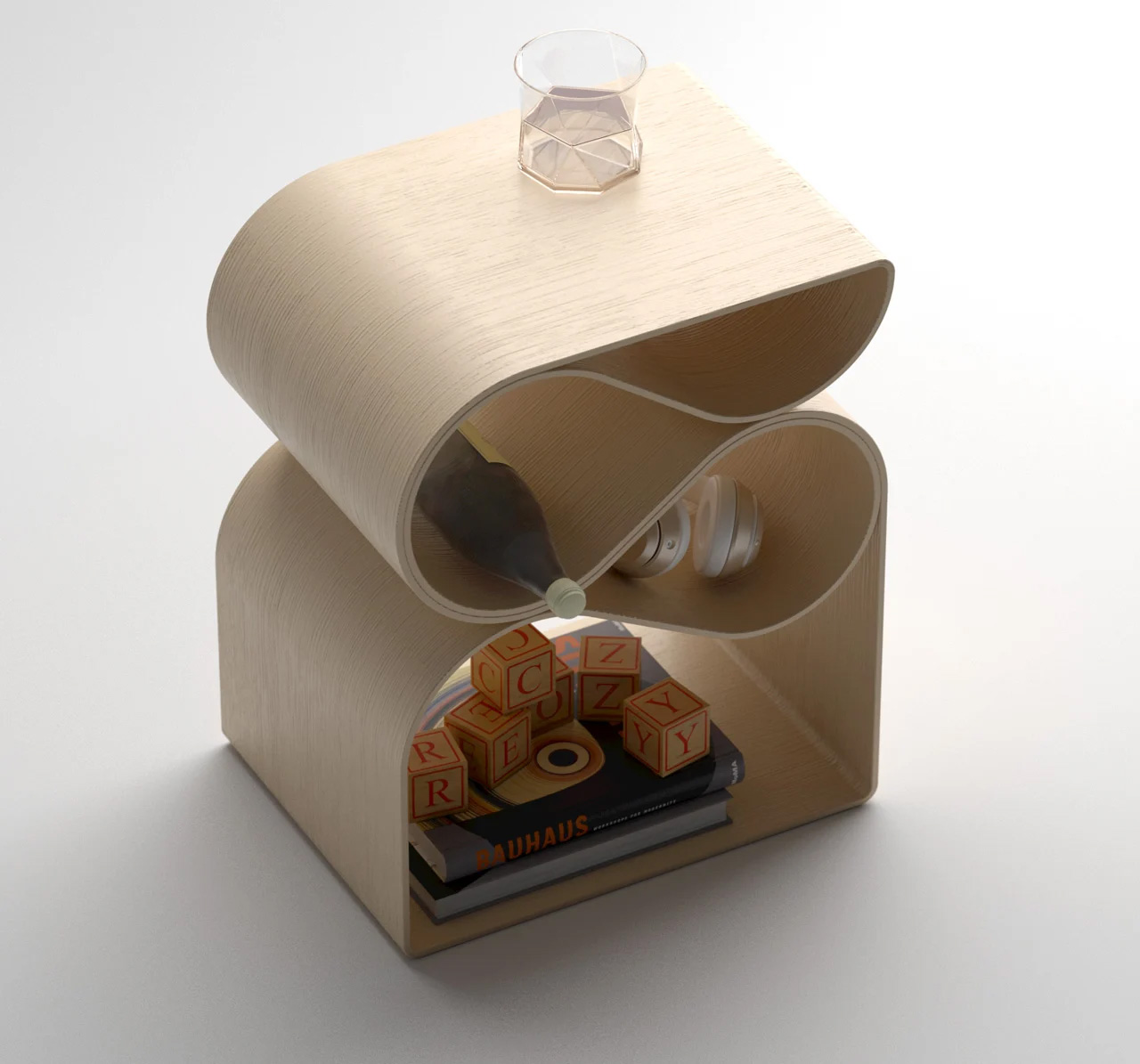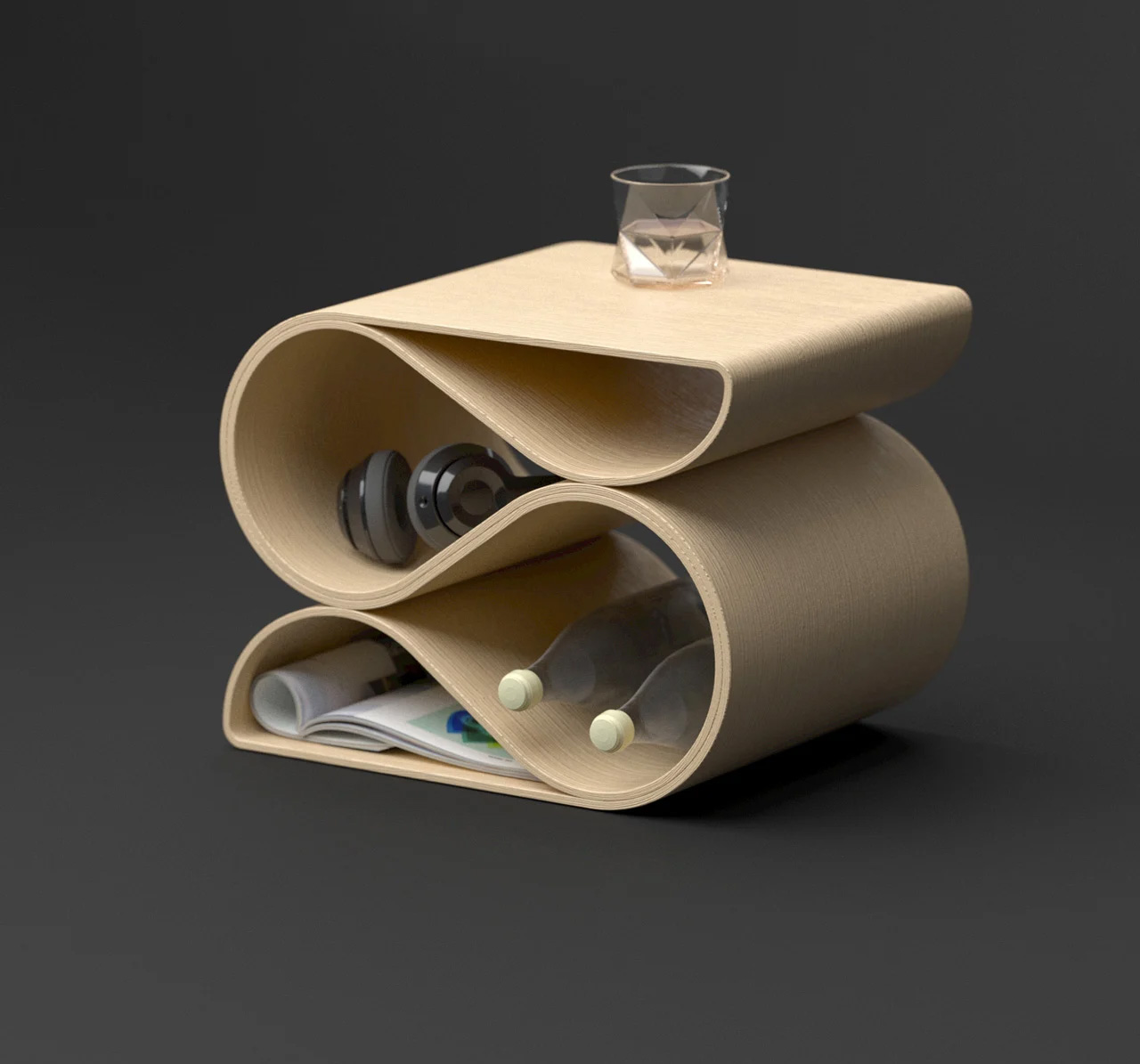 اين ميز که توسط Deniz Aktay طراحي شده است، يک قطعه مينيمال و شيک است. ميز کناري با چرخاندن يک لوله شيشه اي استاندارد ساخته شده است. اين پيچ و تاب و در هم تنيدگي منجر به ايجاد دو قسمت شده که از هم جدا مي شوند. چرخاندن لوله يک محصول ساده و کارآمد ايجاد کرده است که به هيچ ماده اضافي نياز ندارد.