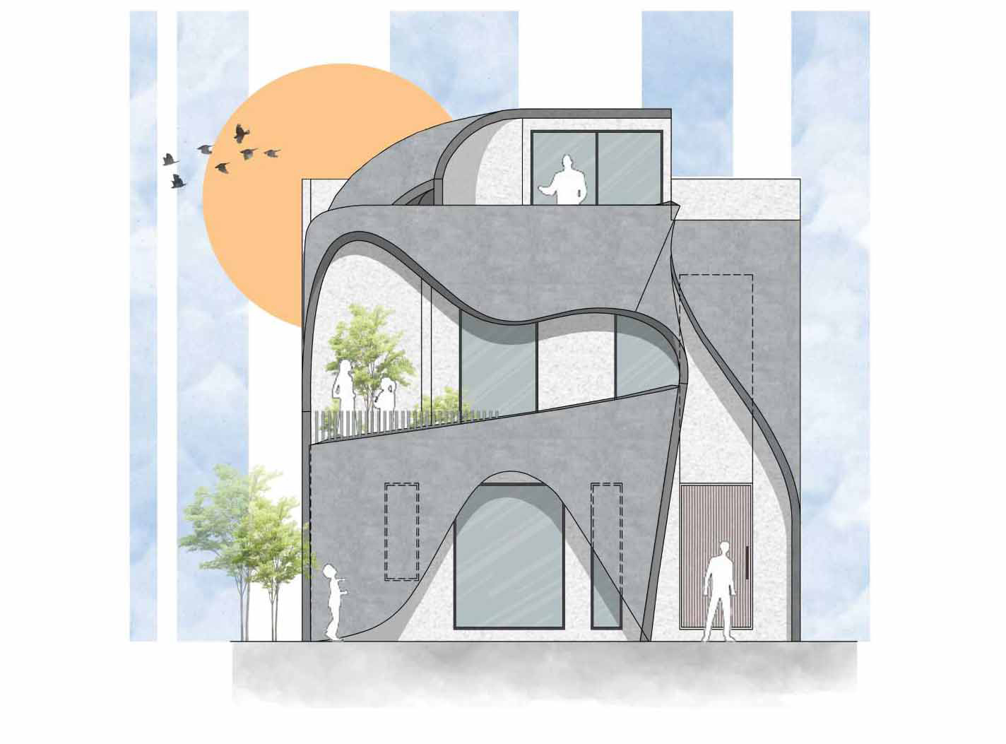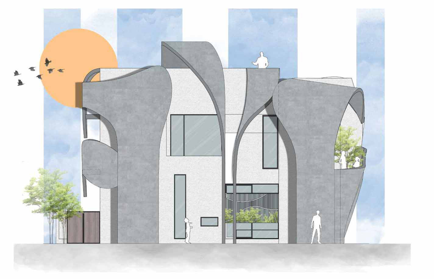 به گزارش گالري آنلاين، نماي بيروني خانه از چين هاي يک روبان و همچنين طبيعت و شکل سيال آن الهام گرفته شده است.