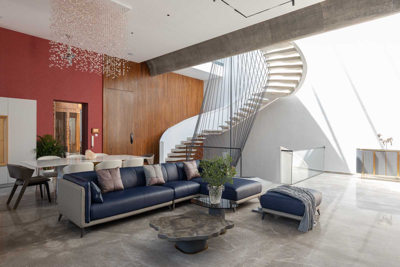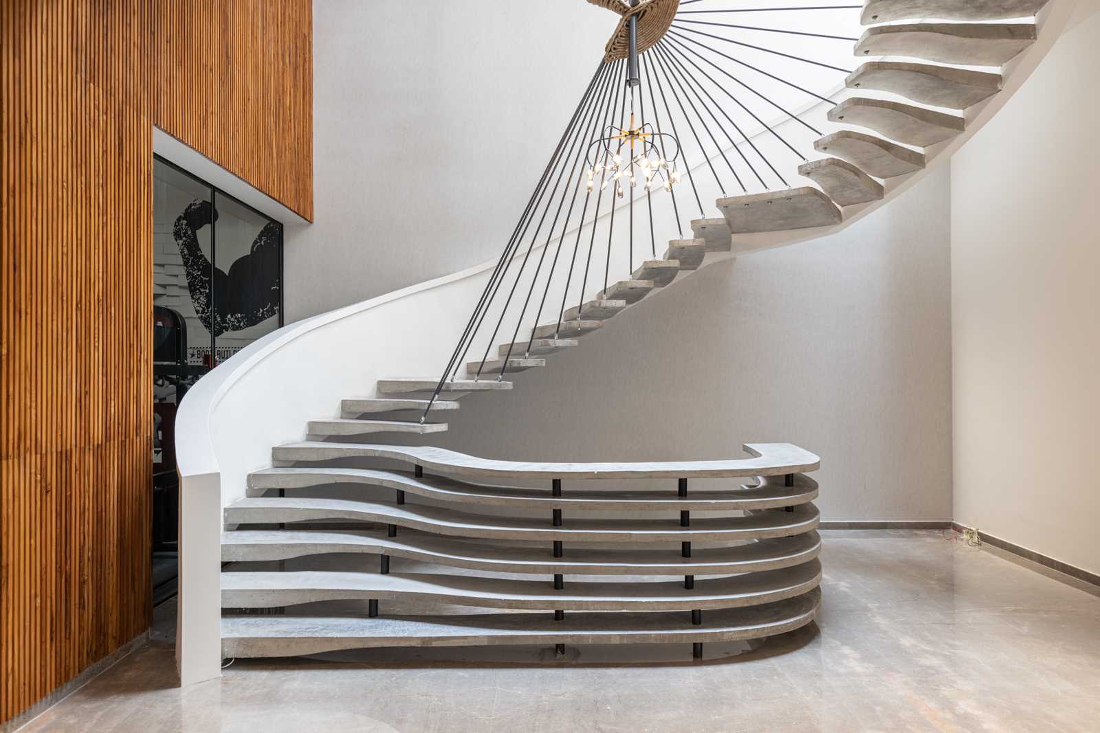 در طرف ديگر ناهارخوري، پلکاني مارپيچ با جزئيات سيمي هنري وجود دارد که توهم يک پازل را به وجود ميآورد، فضاهاي عمودي را به هم متصل ميکند و هنگام رفتن به طبقات بالا، خود را باز ميکند.