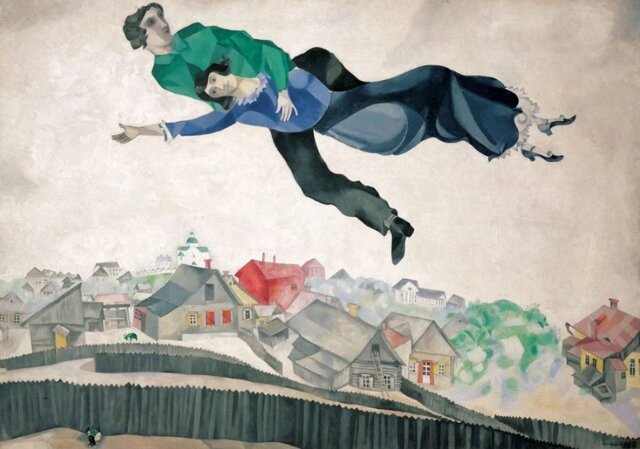 «شاگال» نميتوانست براي هميشه از وطنش دور بماند. زماني که او براي نخستينبار بازگشت، فقط يک هدف در ذهن داشت: ازدواج کردن با «مري روزفيلد». او دختر يک جواهرساز ثروتمند بود و آن دو در سال ۱۹۱۵ ميلادي ازدواج کردند. «مري» حامي «شاگال» بود و اين نکته را ميتوان در نقاشيهايي همچون «بر فراز شهر» تماشا کرد. در اين نقاشي اين زوج طوري با خوشحالي بر فراز شهر «ويتبسک» پرواز ميکند که گويي هيچ چيز ديگري اهميت ندارد. اين نوع اثر هنري از جمله محبوبترين آثار کارنامه او به شمار ميرود.