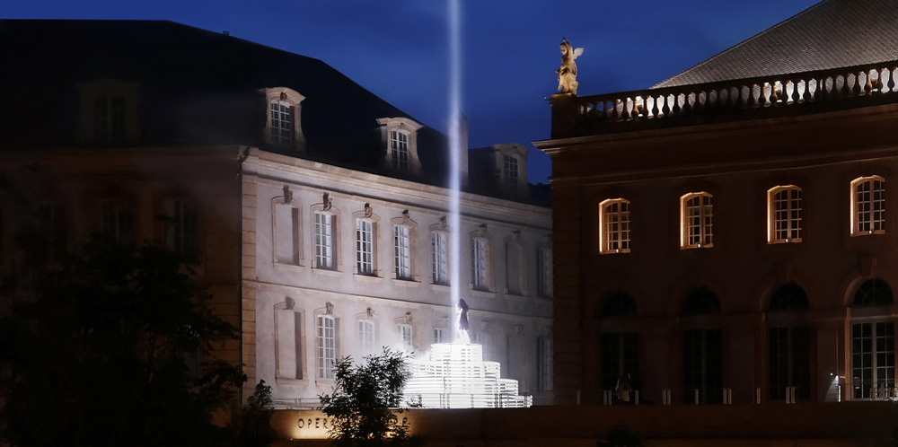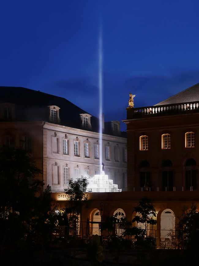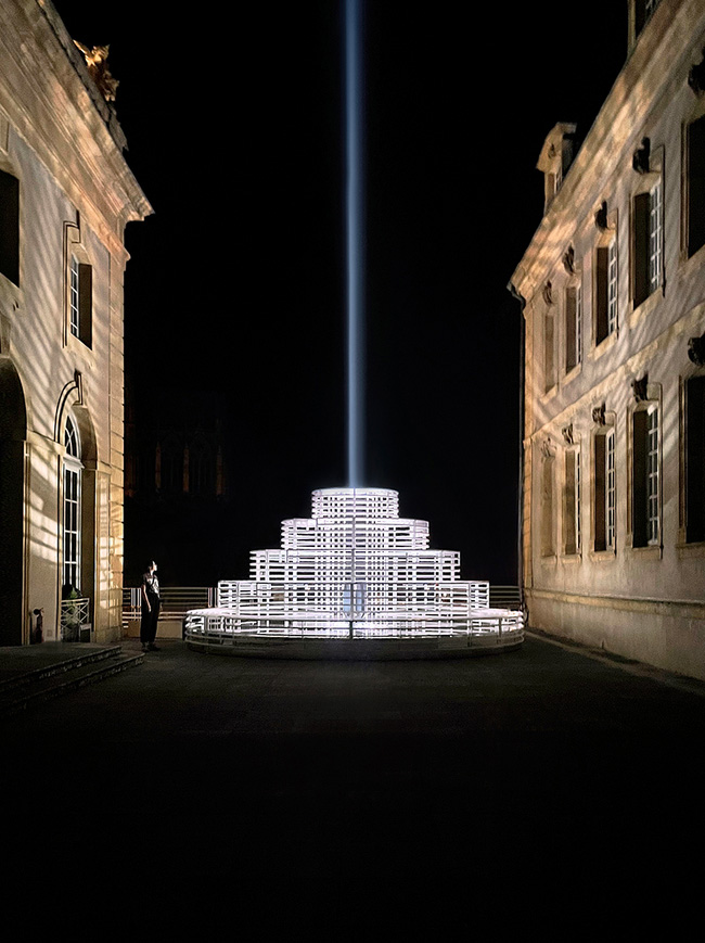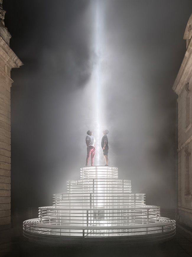 به گزارش گالري آنلاين، پرتو رو به بالا به سمت آسمان امتداد مي يابد و از دور قابل مشاهده است و مانند يک نيروي مغناطيسي جمعيت را به داخل مي کشاند. اين سازه مخاطب را دعوت مي کند تا به اوج خود صعود کند و خود را در تداخل نور و مه غوطه ور کند و در اصل به يک بناي زنده تبديل شود.
