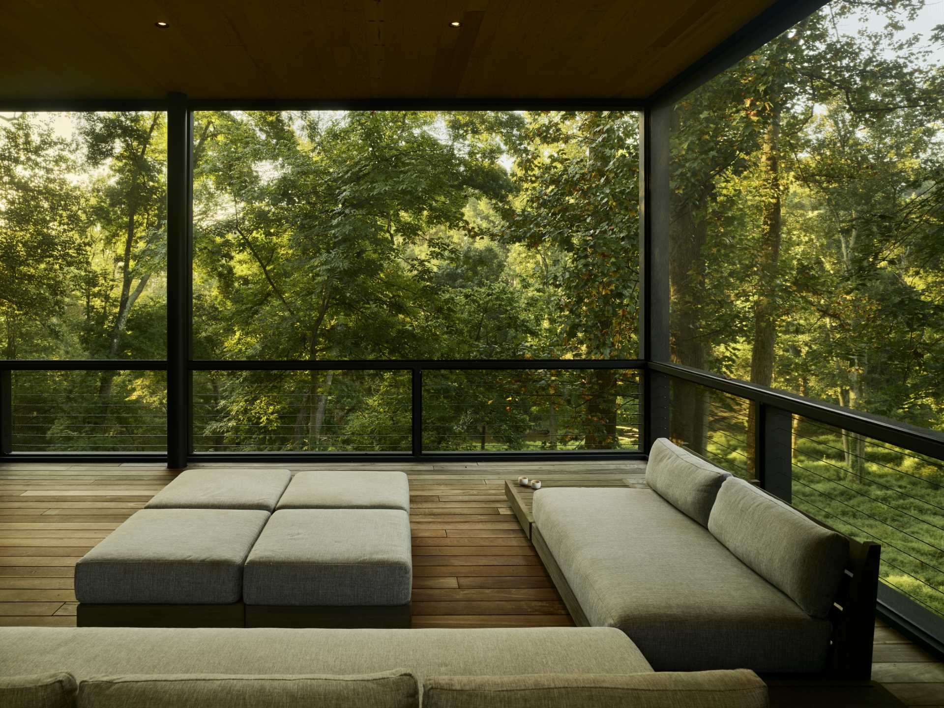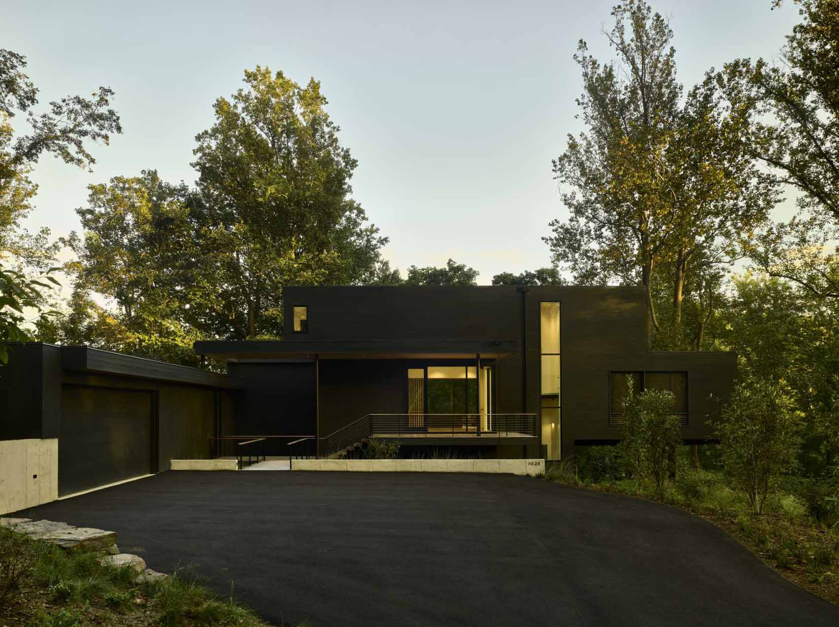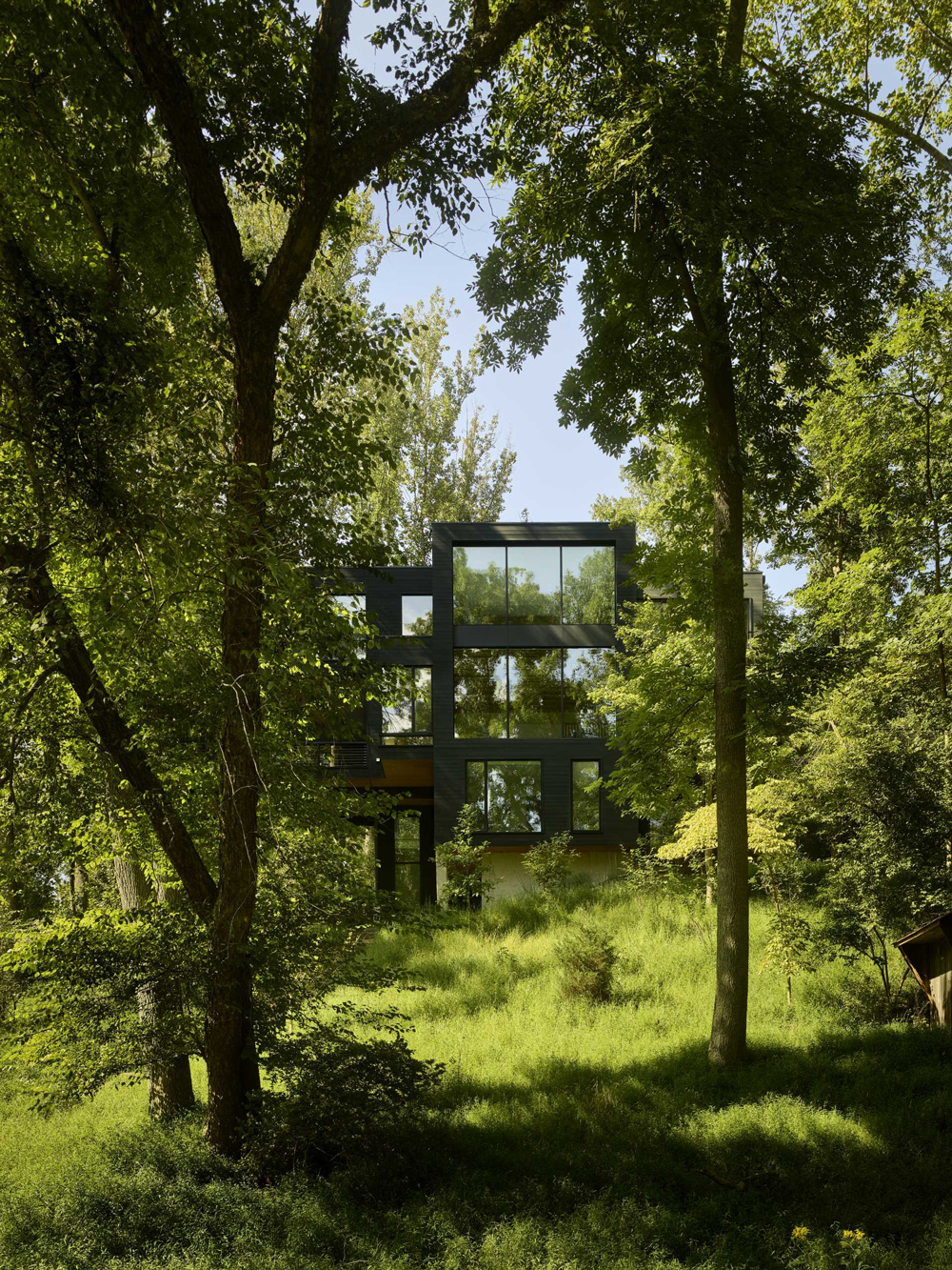 معماران Robert Young عکسهايي از خانه مدرني را که در Virginia طراحي کردهاند، به اشتراک گذاشته اند که توسط يک جنگل احاطه شده است و داراي نماي بيروني تاريک است.