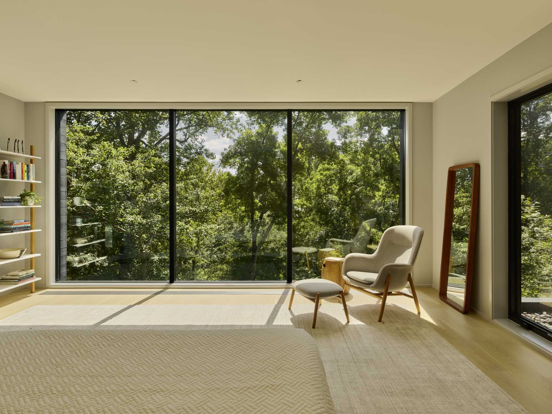 در يکي از اتاق خواب ها، پنجره هايي از کف تا سقف وجود دارد که نور طبيعي فراواني را ارائه مي کند.
