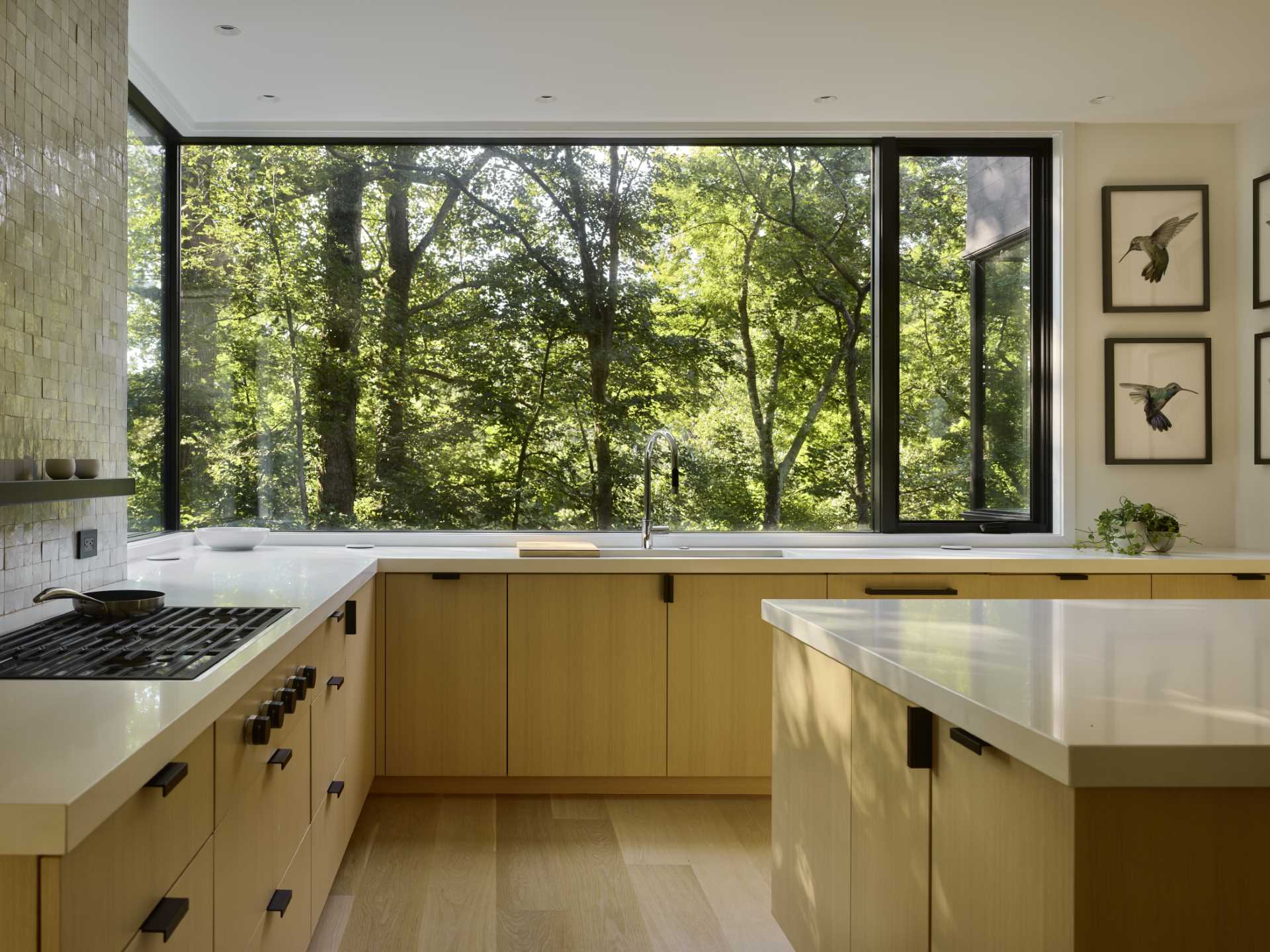در آشپزخانه، کابينت ها به گونه اي طراحي شده اند که امکان لذت بردن از منظره درخت ها را فراهم مي کند.