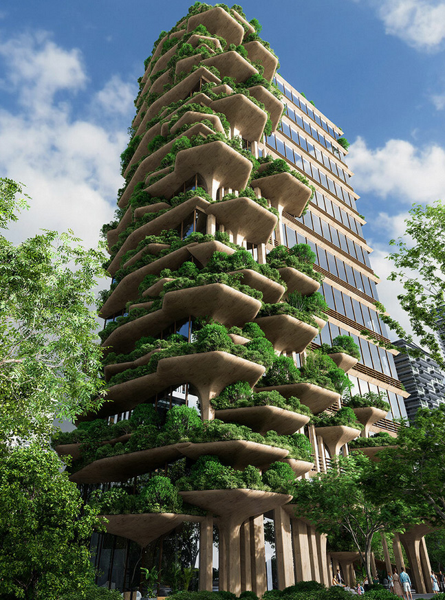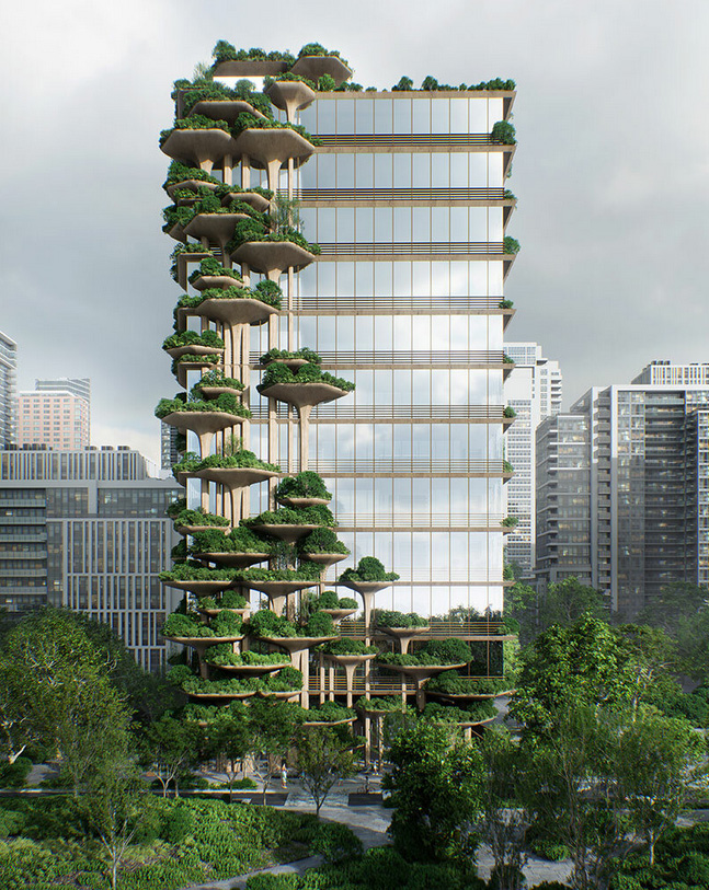 اين استراتژي توسط مفهوم طراحي بيوفيليک هدايت ميشود – رويکردي که از فرآيندهاي طبيعي درس ميگيرد و آنها را در ايجاد محيطهاي انسانساخته مرتبط با طبيعت به کار ميگيرد. معماران اين اصل را در تار و پود برج مي بافند و يک رابطه همزيستي بين فضاي ساخته شده و اکوسيستم زنده ايجاد مي کنند. کاشتهاي پراکنده که بازتاب رشد قارچهايي که تنه درخت را مستعمره ميکنند هستند، بيش از يک زينت ساده هستند. آنها به قسمت هايي تبديل ميشوند که هوا را تصفيه ميکنند، پناهگاهي براي تنوع زيستي فراهم ميکنند و به ساکنان پيوند مستقيمي با طبيعت در ميان بافت شهري شلوغ ارائه ميدهند.