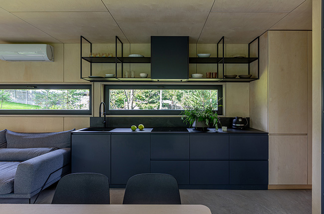 نماي کابين با چوب سوخته شده با تکنيک ژاپني Shou Sugi Ban تکميل شده است در حالي که فضاي داخلي با تخته سه لا روي ديوارها، مبلمان و درها تزئين شده است. روکش بتني صيقلي کفپوش را تکميل ميکند و روکشهاي مشکي مات در امتداد اتصالات فضايي شيک و مدرن را تداعي ميکنند. پنجره هاي کف تا سقف، هم منظره زيبا و هم بهره وري انرژي را تضمين مي کنند.