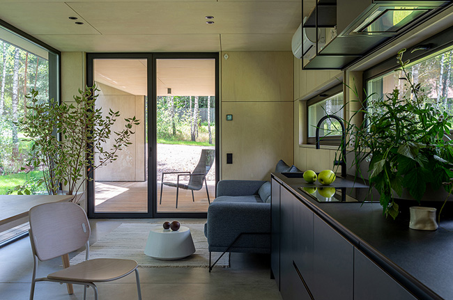 خود کابين داراي يک چيدمان ساده و در عين حال کمفضا با همه عناصر جمعوجور و کاربردي است – از جمله فضاي آشپزخانه-نشيمن چسبيده به هم، با آشپزخانه بزرگ، حمام با دوش و يک اتاق خواب با ميز کار. ما طرح خانه را با استفاده از يک قاب چوبي که براي آب و هواي سرد نيز مناسب است طراحي کرديم. براي اطمينان از يکپارچگي سازه در طول حمل و نقل، قاب چوبي با عناصر فولادي تقويت مي شود.