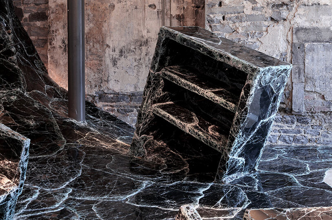 اثر Dark Tide الهام گرفته از ساختمان بازسازي شده‌ي خود Debombourg است که در آن آثار تاريخي در کنار عناصر معماري معاصر قرار دارند. هنرمند با برداشتن يک قدم جلوتر، فضاي نمايشگاه را به عنوان دفتري با پلان باز تصور مي کند که توسط يک فاجعه طبيعي آسيب ديده است.