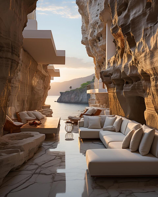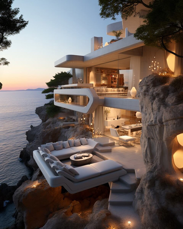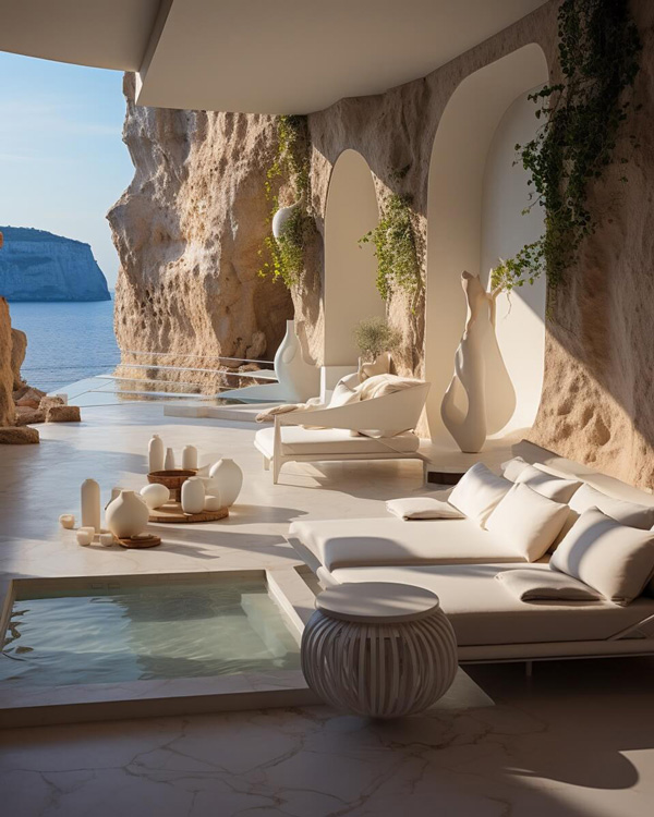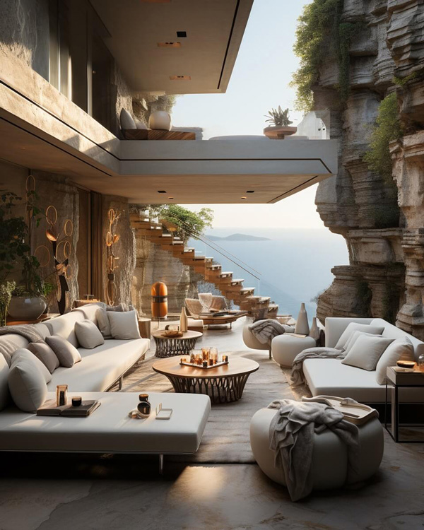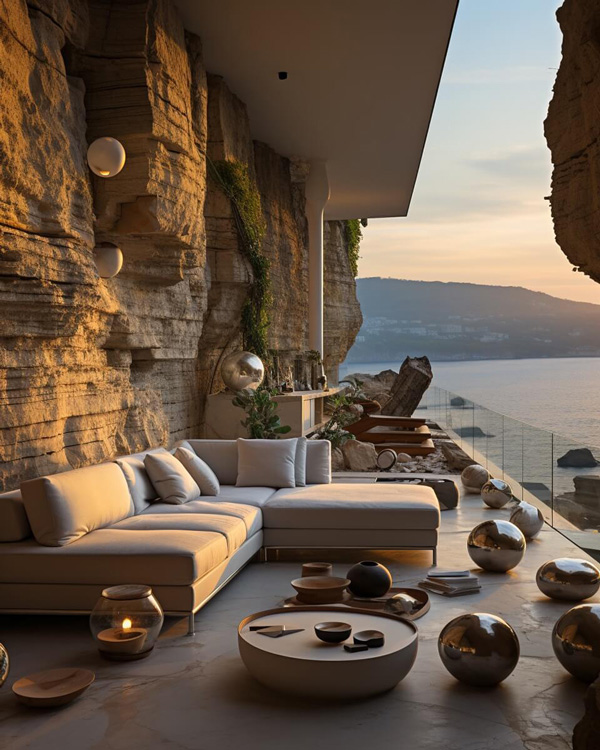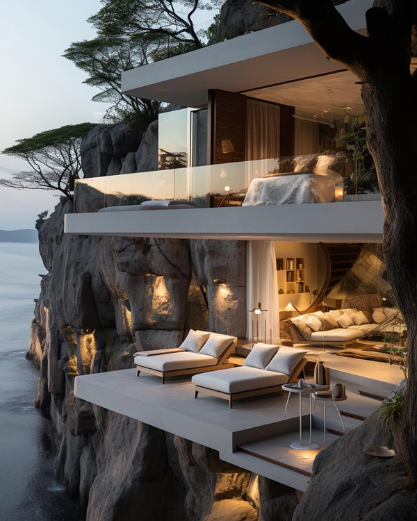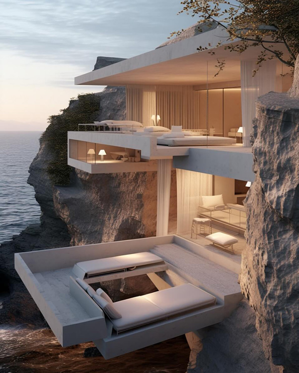به گزارش گالري آنلاين، نماي بيروني ويلا با بتن سفيد تضاد چشمگيري را با زيبايي رام‌نشده صخره‌ها ايجاد مي‌کند. اين انتخاب متريال نه تنها زيبايي شناسي مدرن ويلا را افزايش مي دهد، بلکه به عنوان يک بوم براي برجسته کردن عناصر طبيعي اطراف عمل مي کند. به نظر مي‌رسد که ساختار سفيد کاملاً از خود صخره بيرون مي‌آيد، گويي امتداد طبيعي منظره است.