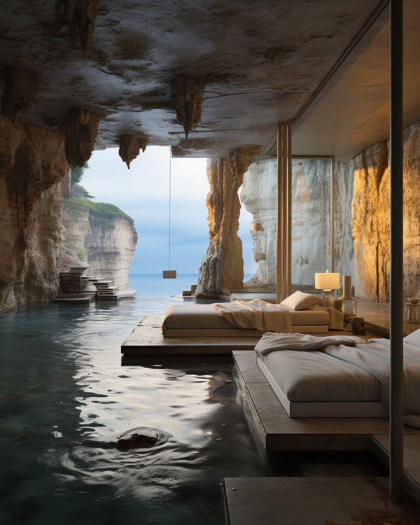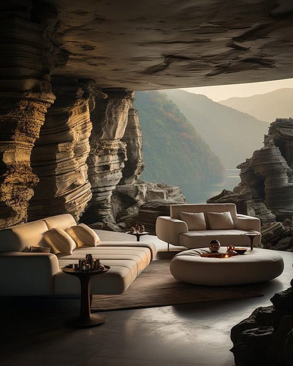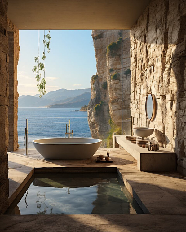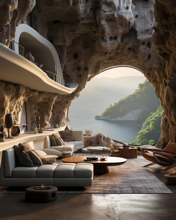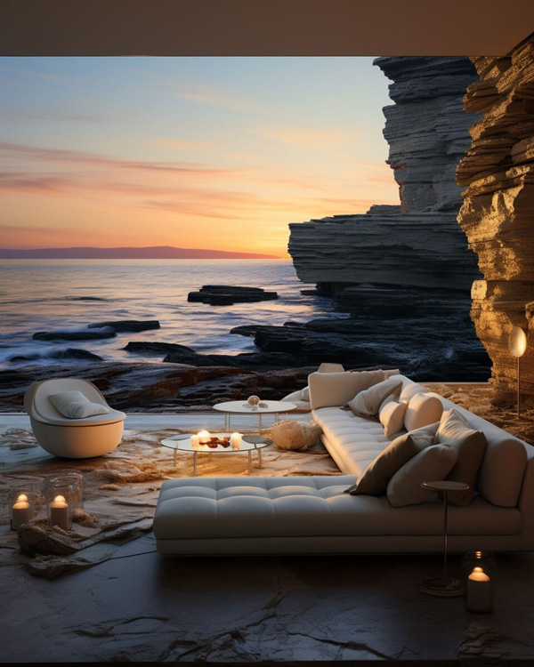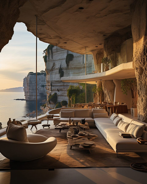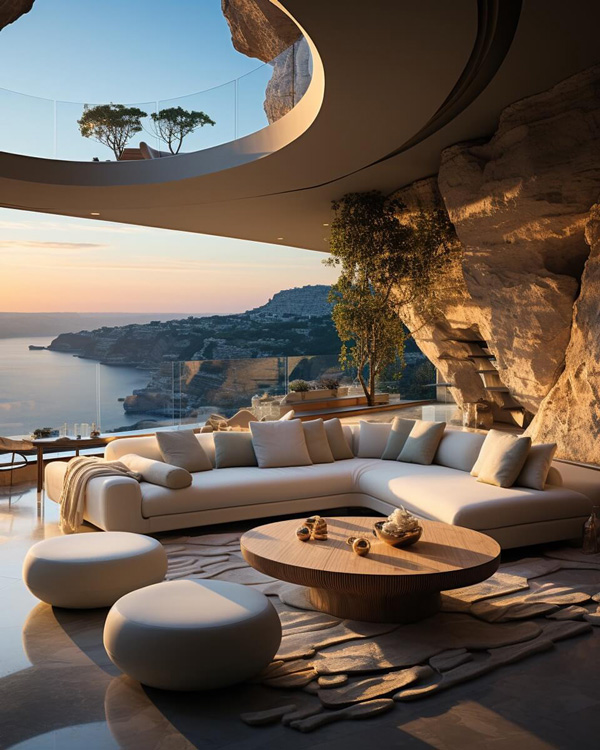 به گزارش گالري آنلاين، نماي بيروني ويلا با بتن سفيد تضاد چشمگيري را با زيبايي رام‌نشده صخره‌ها ايجاد مي‌کند. اين انتخاب متريال نه تنها زيبايي شناسي مدرن ويلا را افزايش مي دهد، بلکه به عنوان يک بوم براي برجسته کردن عناصر طبيعي اطراف عمل مي کند. به نظر مي‌رسد که ساختار سفيد کاملاً از خود صخره بيرون مي‌آيد، گويي امتداد طبيعي منظره است.