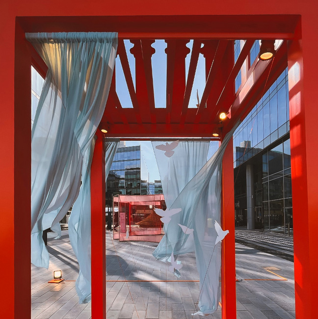 به گزارش گالري آنلاين، در هم آميختن معماري، طبيعت، و روايتهاي انساني، پردههاي آبي شفاف رقصنده در باد و آينه اي ايجاد ميکند.