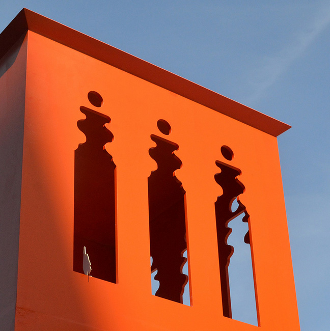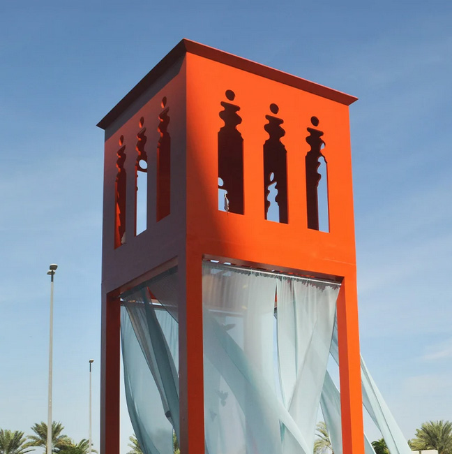 برج هاي باد که در ابتدا به عنوان دستگاه هاي تهويه مطبوع طبيعي طراحي شده بودند، از تفاوت هاي دمايي در داخل و خارج از ديوارهاي برج باد استفاده مي کنند تا جريان هواي بهينه را در داخل ايجاد کنند. به طور معمول، يک حوض آب يا کانالي در داخل برج قرار مي گيرد که به هواي ملايم تر کمک مي کند، پديده اي که در طراحي عباس منعکس شده است. اين هنرمند توضيح ميدهد: از پرده هاي شفاف و بلند استفاده کرد تا حرکت نسيم و هواي زير برج را منعکس کند. از آنجايي که ما اغلب فقط جريان اين هوا را تصور مي کنيم و آن را نمي بينيم، از پرده استفاده کردم تا به مردم اجازه دهم جريان نسيم ملايم را در برج هاي باد تجسم کنند. اين عنصر معماري، ساختاري محکم، حرکات برازنده نسيم ملايم را در ديوارهايش در بر مي گيرد.
