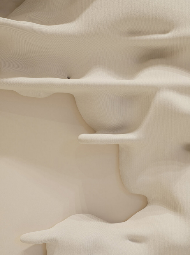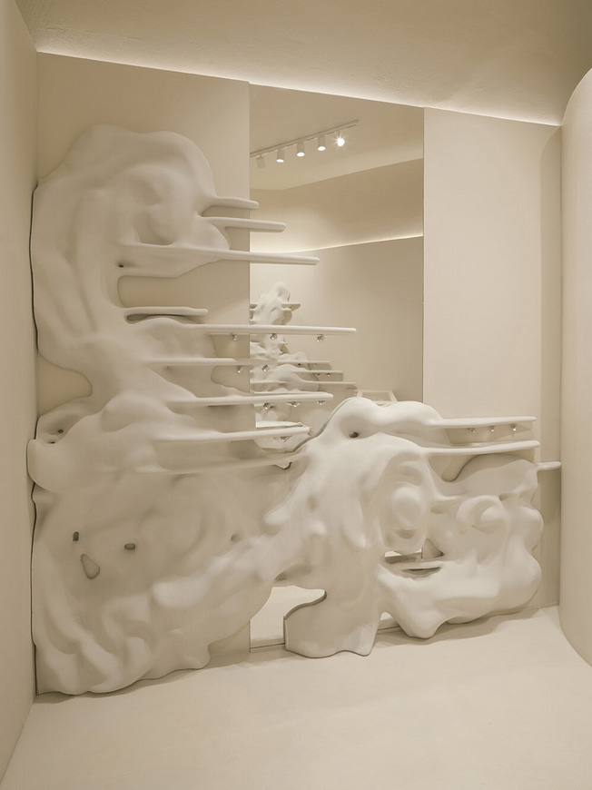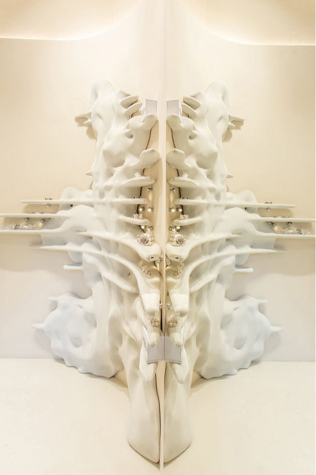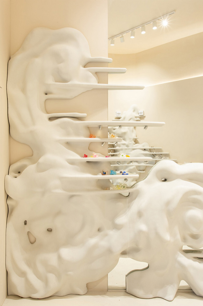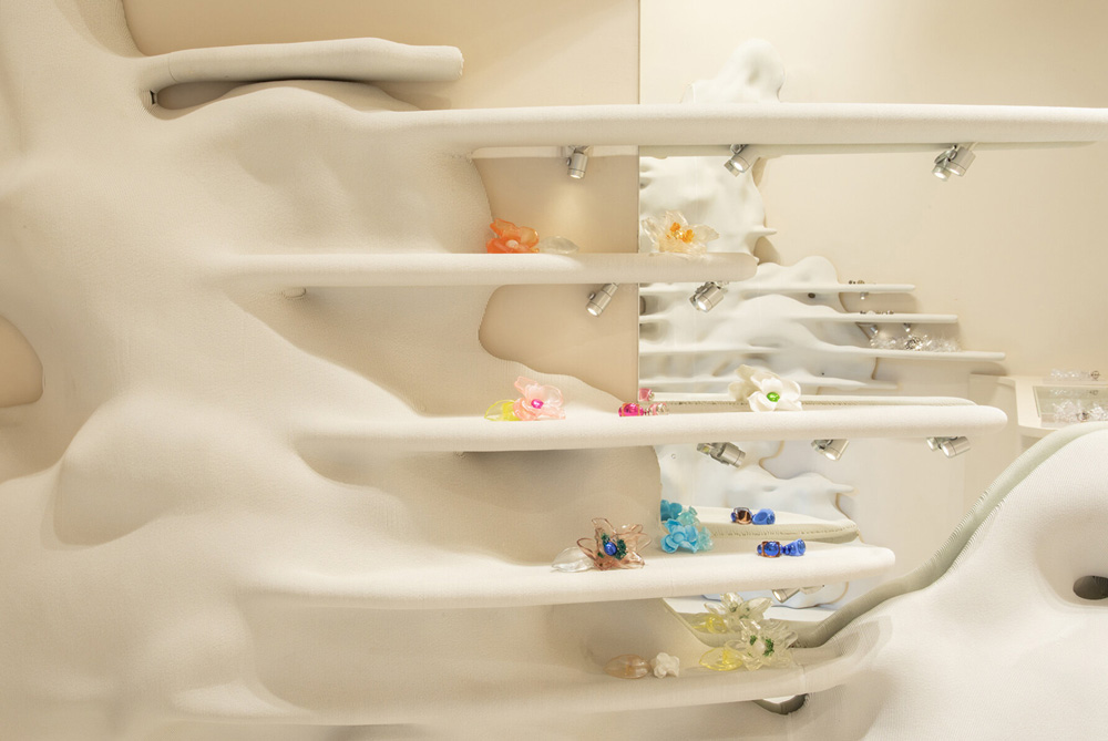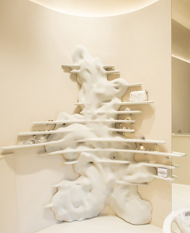 قفسه هاي ساخته شده با چاپ سه بعدي LAMÁQUINA، بازتابي از انعطاف پذيري را با قفسه هاي ساخته شده با چاپ سه بعدي که توسط LaMáquina طراحي شده است، فضاي داخلي فروشگاه را در ادامه و مکمل نماي بيروني ساختمان تجسم مي کند. فرمهاي ارگانيک در کانون توجه قرار گرفته و تزيينات نما را به گل سرخهاي بزرگ و نقوش برجسته فوتوريستيک تبديل مي کند که در ارتفاع 90 سانتيمتري تا 1.70 متري چيده شده اند. اين قفسه ها جواهرات و زيور آلات La Manso را در اطراف يک ميز مرکزي کوچک به نمايش گذاشته که با چراغ هاي کوچک و قابل تنظيم نورپردازي شده اند. سطوح منعکس کننده نور فضا را بزرگتر کرده و در عين حال با جلاي خنثي و زيبا، پس زمينه اي انتزاعي براي قفسه هاي نمادين خلق مي کند.
