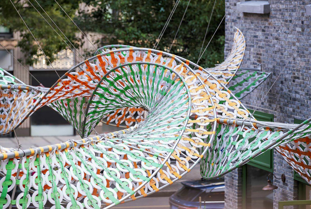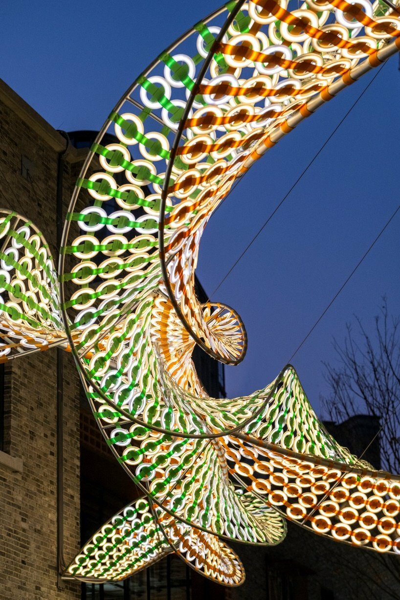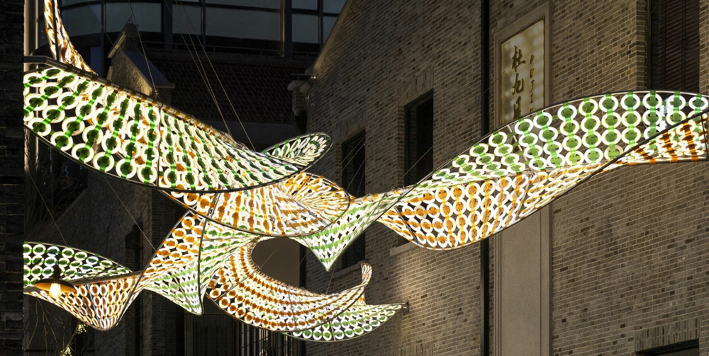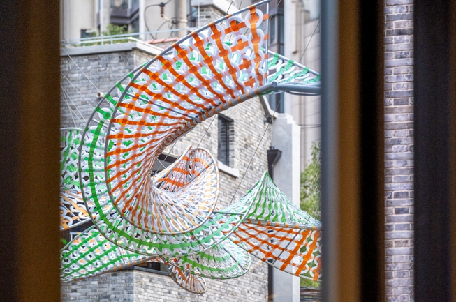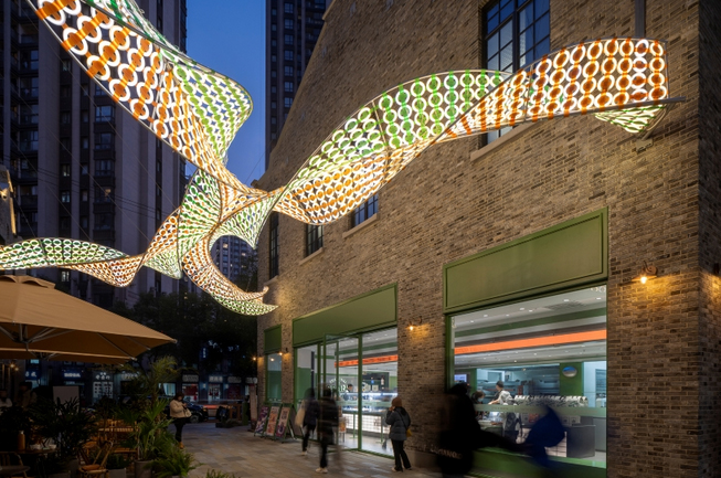 به گزارش گالري آنلاين، يک چيدمان مارپيچي پر جنب و جوش توسط استوديو HCCH از رهگذران به ورودي منطقه تجاري تازه ساخته شده به سبک شيکومن در شانگهاي استقبال مي کند. اين اثر هنري عمومي که از 1300 حلقه نوراني بيضي شکل و نوارهاي رنگارنگ تشکيل شده است، شباهتي به موجودي اژدهايي شکل دارد که سال نو قمري را جشن مي گيرد. با توجه به تمرکز اين منطقه بر فروشگاههاي مواد غذايي محلي، هدف تيم طراحي اين بود که اين قطعه شبيه شيريني سرخ شده پيچ خورده «youtiao» باشد، يک صبحانه سنتي در شانگهاي. اينستاليشن به دست آمده، منطقه شهري را با عناصر نوستالژيک و زيباييشناسي القا ميکند.