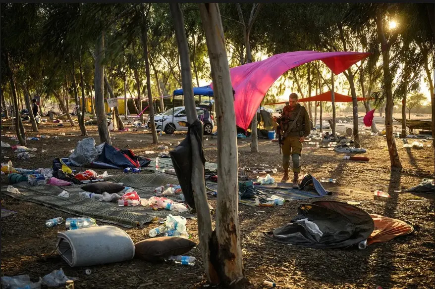 يکي از اعضاي نيروهاي امنيتي اسرائيل به دنبال شناسايي وسايل شخصي در ميان وسايل دور ريخته شده در محل جشنواره موسيقي سوپرنوا/ نوار غزه