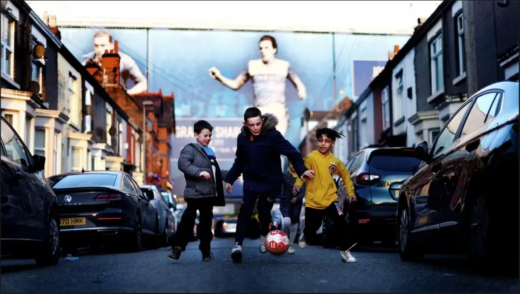 کودکان در خارج از پارک گوديسون در خيابان ماشينرو فوتبال بازي ميکنند/ زمان ۳ آوريل ۲۰۲۳