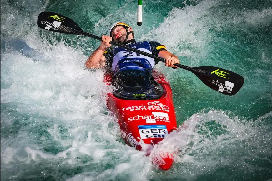 استفان هنگست (ورزشکار آلماني) در مرحله نيمهنهايي مسابقات کاياک مردان با عنوان «مسابقات قهرماني جهاني کانو اسلالوم ICF»/ مکان: مرکز لي ولي وايت واتر، شمال لندن/ تاريخ عکسبرداري: ۲۳ سپتامبر ۲۰۲۳