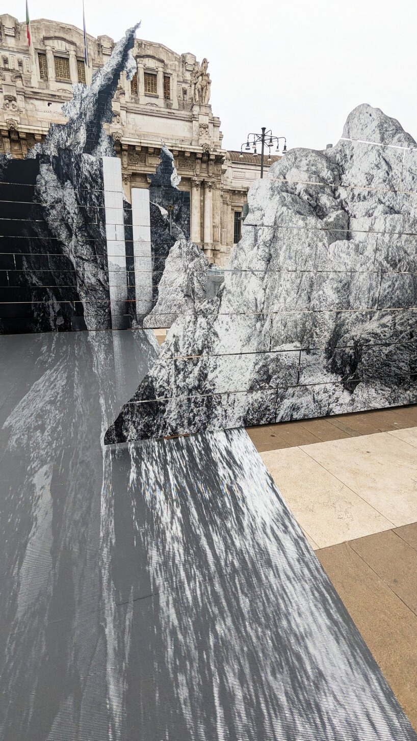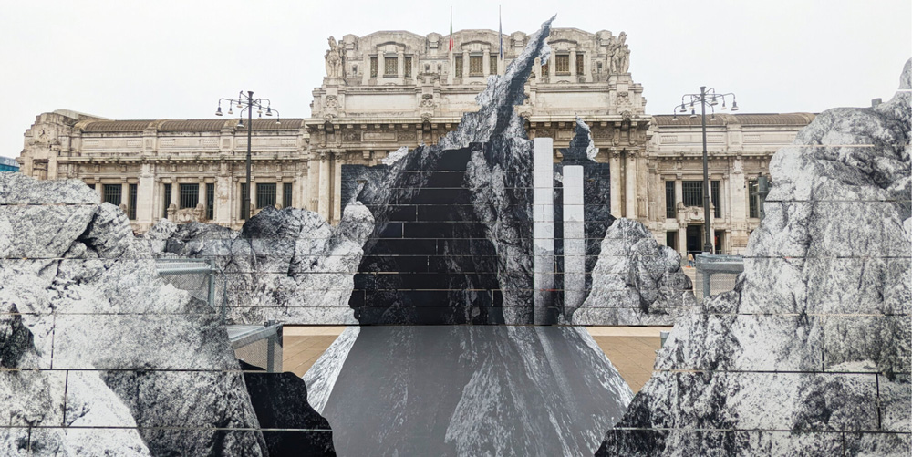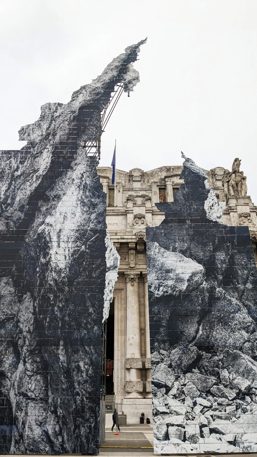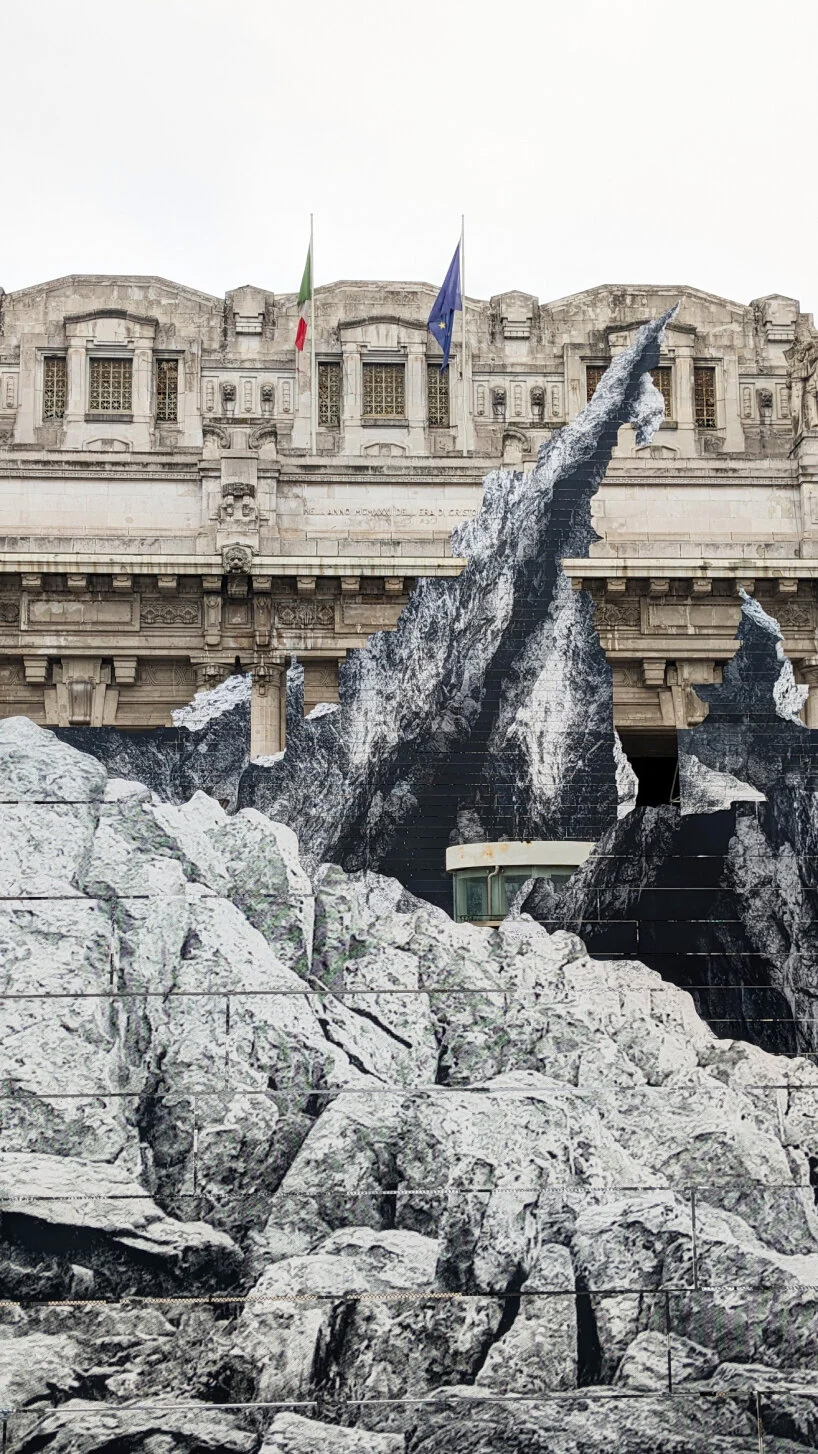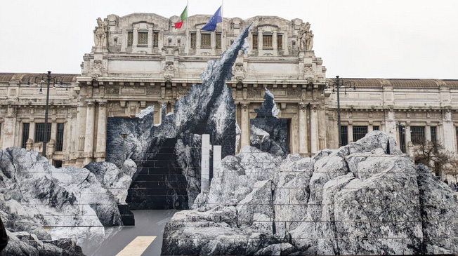 هنرمند JR در توضيحات خود مي گويد:" از يک نقطه نظر، مي توان متوجه ارتباط اثر هنري با بناي ايستگاه مرکزي ميلان شد؛ اما در حقيقت با عبور از ميدان به علت وجود لايه هاي مختلف به زواياي مختلف آن نيز پي خواهيد برد. بنابراين، مي توانيد از ميان کوه ها عبور کرده و جلوه هاي بصري متفاوت آنها را ببينيد. براي اولين بار است که با اشکال اين چنيني کار مي کنم که در واقع تا حدودي چيدمان موزه لوور را تداعي مي کند. اما در آن چيدمان از اهرام کوچک استفاده کرده بودم؛ در اينجا، مجبور شدم پانل ها و قطعات مختلف را با داربست سازي ايجاد کنم تا بتوان تمام سطح ميدان را پوشش دهم و ايستگاه قطار بينظيري ايجاد کنم."