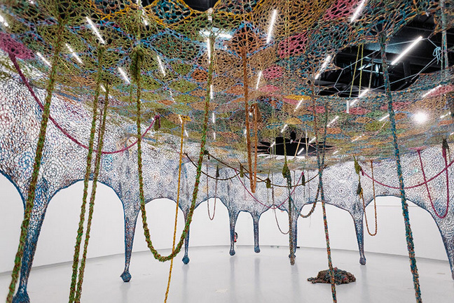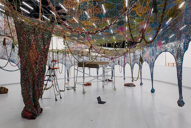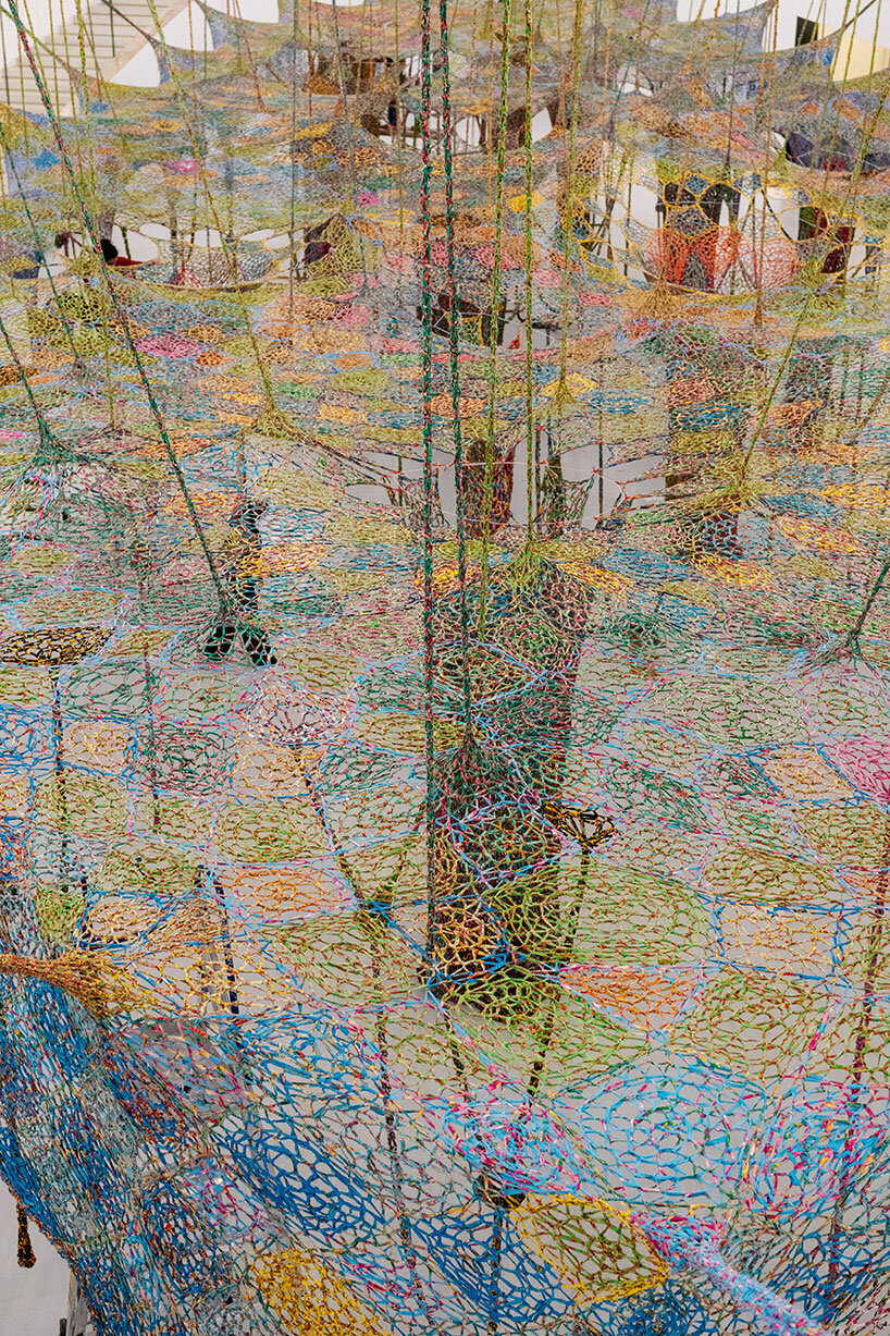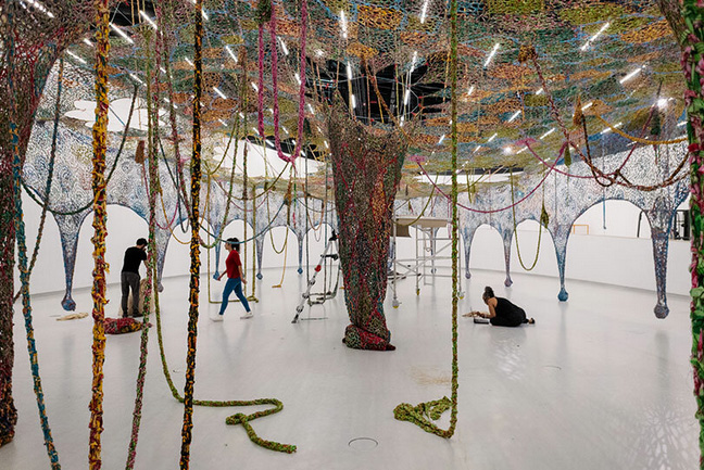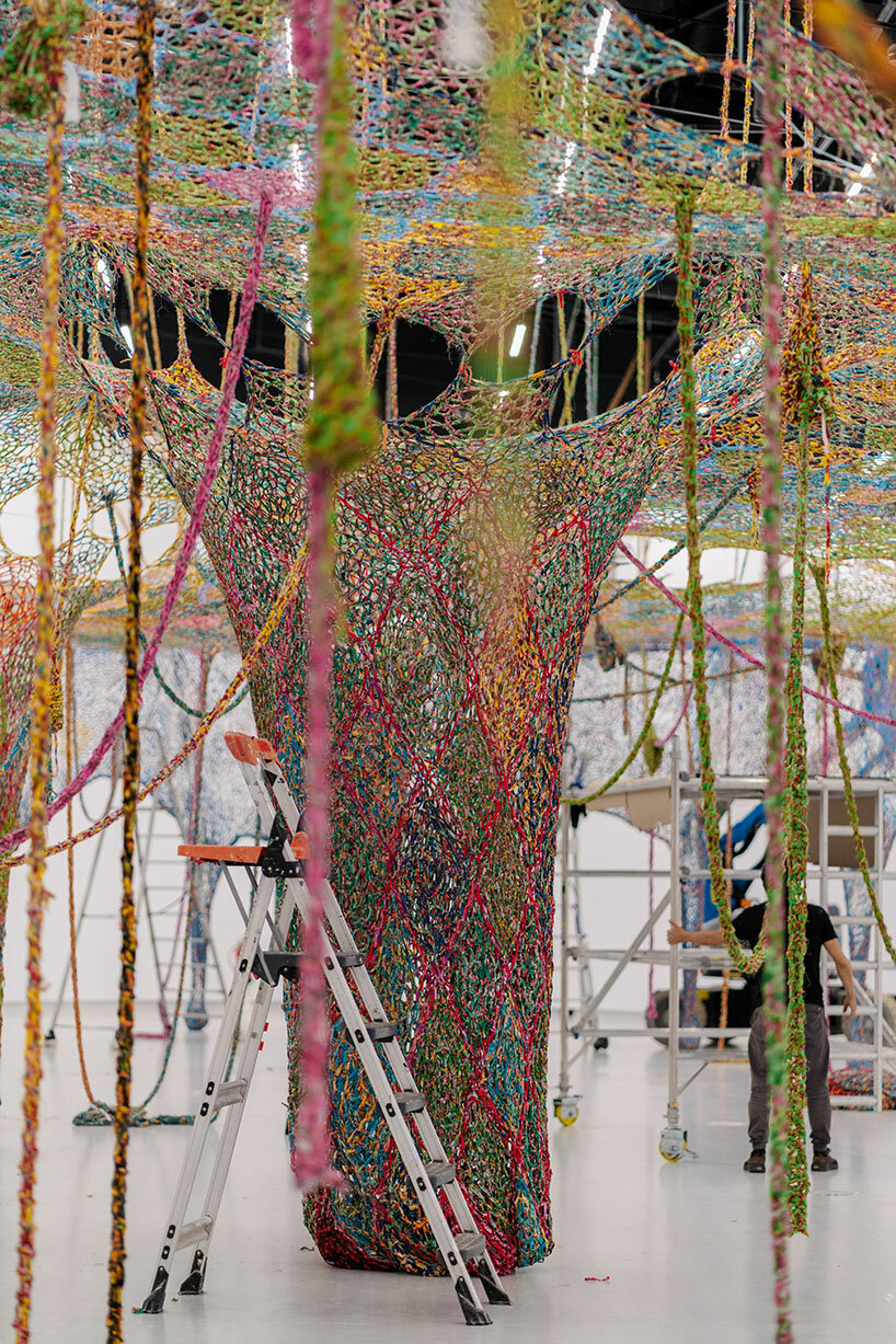 اين هنرمند بطور عمده پارچه چيت را که پارچه پنبه اي مقرون به صرفه و رايج در برزيل و اغلب گلدار است با ظرافت و با کمک دستيارانش بصورت نوار برش داده و با قلاب مي بافد. اين تکنيک که طي سالها در استوديوي اين هنرمند در ريودوژانيرو معروف به Atelienave تقويت شد، پايه و اساس اين اثر را شکل مي دهد که از سوراخ هاي در هم تنيده و بهم پيوسته تشکيل شده است. اجراي اين کار با دست و بدون استفاده از هيچ گونه ابزار انجام شده و براي دقت و هماهنگي اثر با ويژگي هاي منحصر بفرد فضاي نمايشگاه در حين نصب، طراحي چيدمان با آزمون و خطا و تنظيمات توسط نرمافزار تخصصي انجام گرفته است.